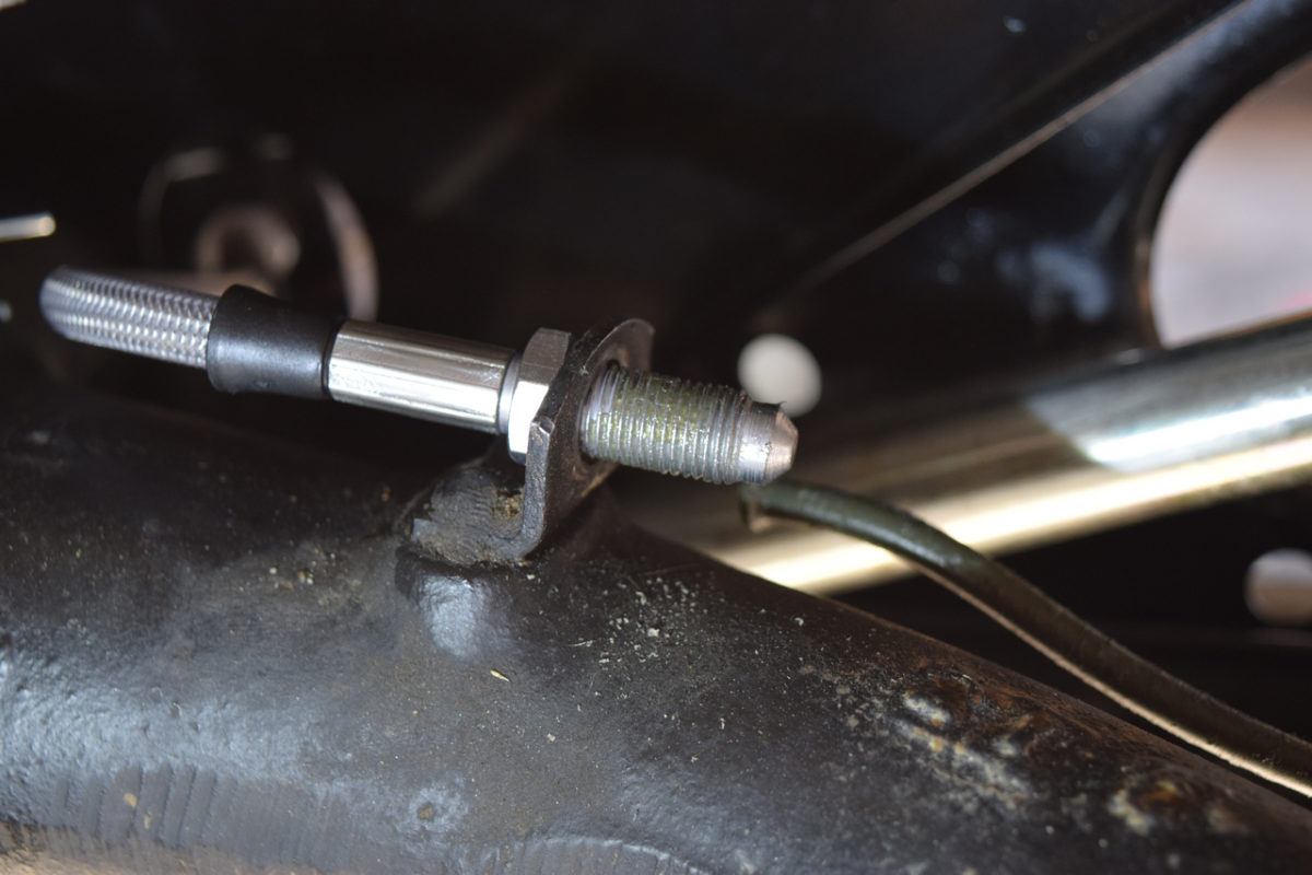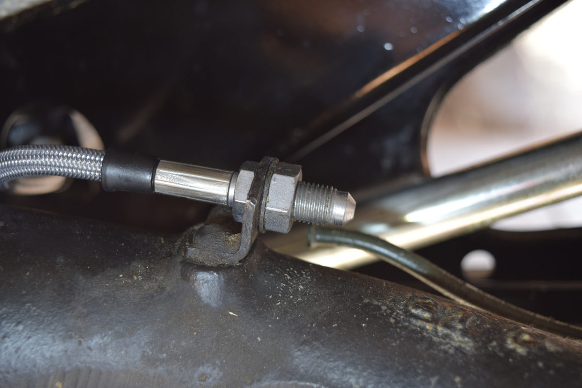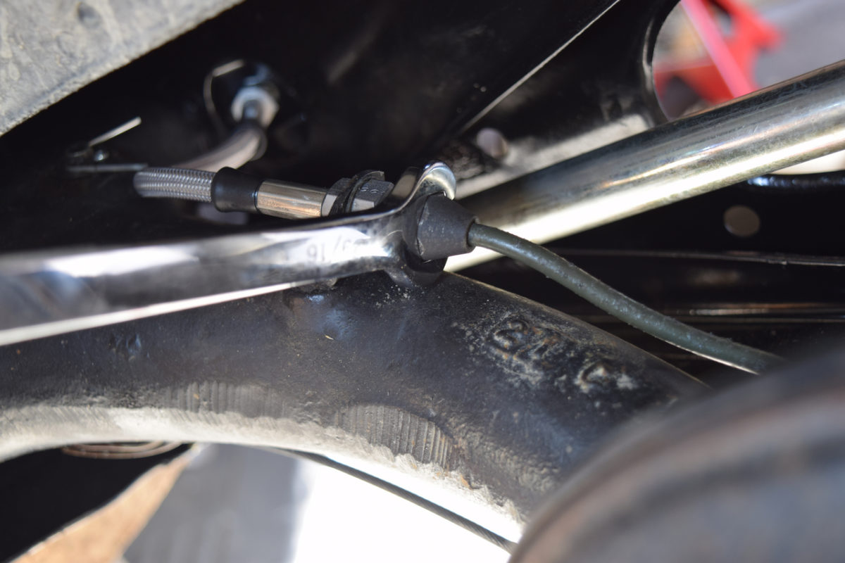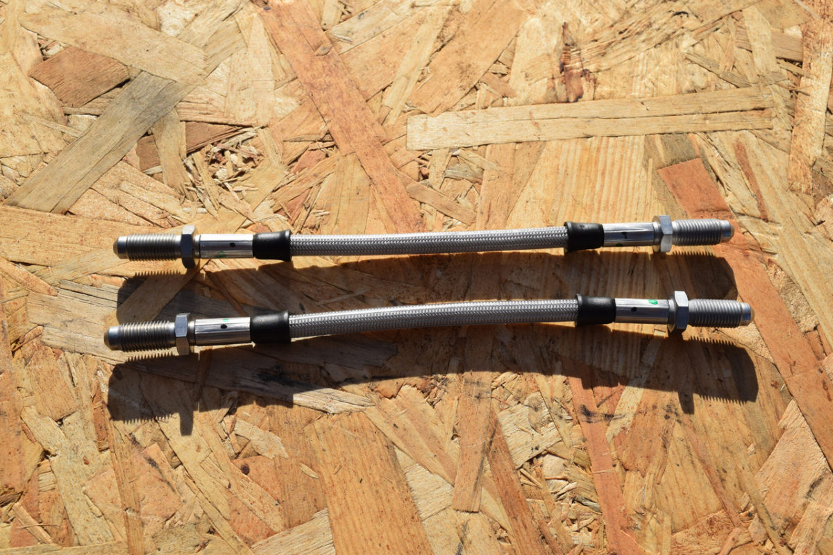 J’ai décidé de monter des flexibles de frein aviation pour remplacer les flexibles d’origine qui ont fait leur temps. Les flexibles “aviation” sont des durites tressées métalliques de la marque Goodridge. Ils offrent une plus grande résistance à la pression du liquide de frein et aux hautes températures que les flexibles en caoutchouc. Cette technique aviation issue de la compétition évite ainsi l’effet “pédale molle” des durites d’origine lorsque les freins chauffent notamment.