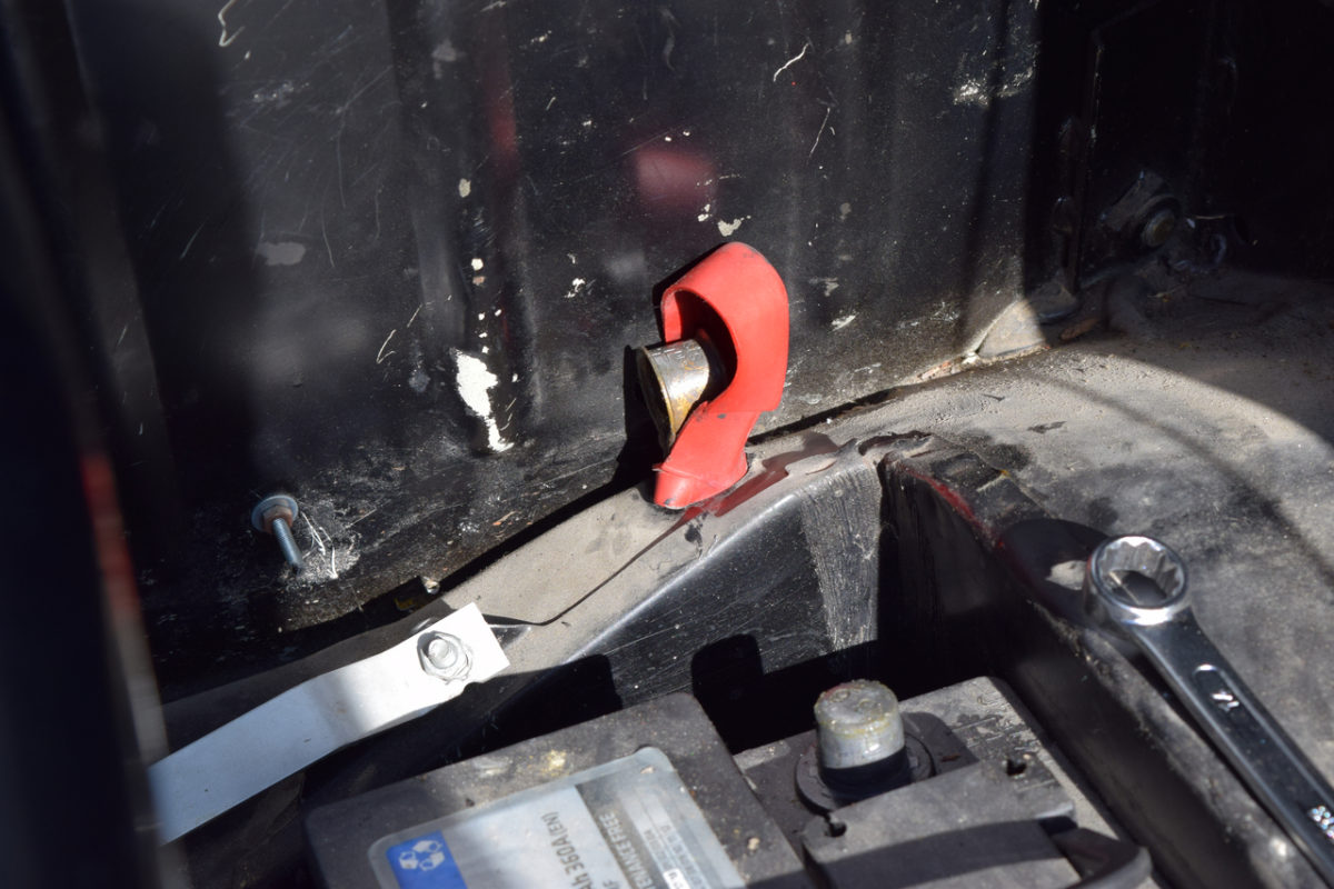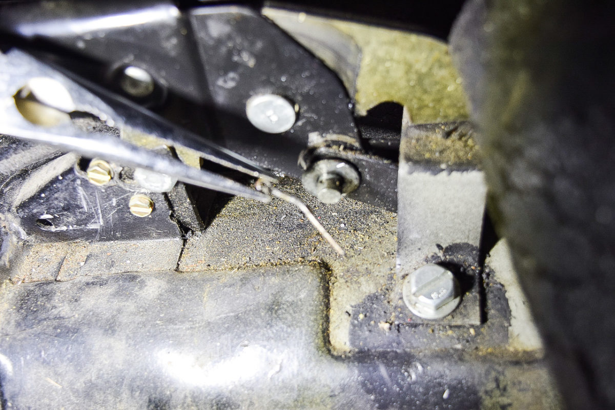 Le câble de démarreur (reliant la batterie au démarreur) est également maintenu à deux endroits sur le berceau arrière pour éviter qu’il ne flotte. Il suffit de les dévisser.
