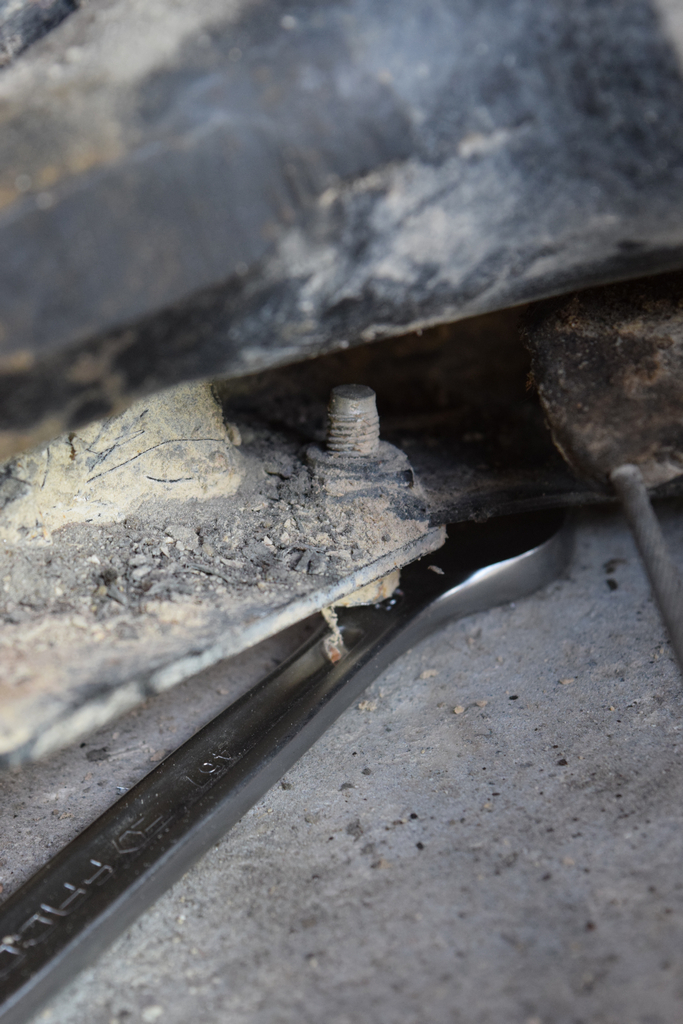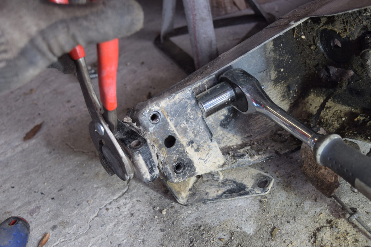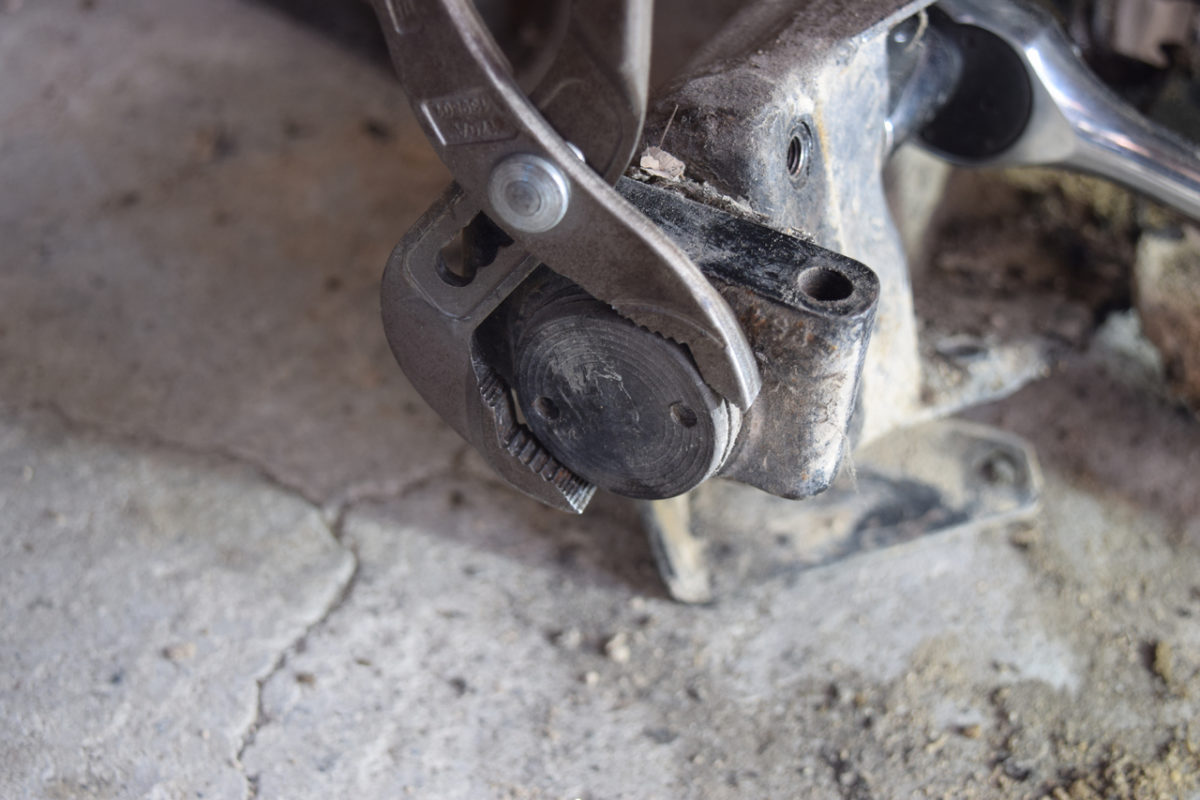 Les silentblocs avant sont fixés avec une grosse vis à l’intérieur du berceau. La tête de vis étant plate et ronde, on ne peut pas la desserrer avec une clé ou une douille. Elle est en revanche équipée de deux ergots mais n’ayant pas la clé à ergots adaptée, j’utilise une pince multiprise pour la maintenir pendant que je desserre l’écrou à l’autre extrémité avec un cliquet. Si vous comptez réutilisez la vis, il est préférable d’utiliser une clé à ergots ou d’utiliser un chiffon sur les mords de la pince multiprise pour ne pas endommager la vis.