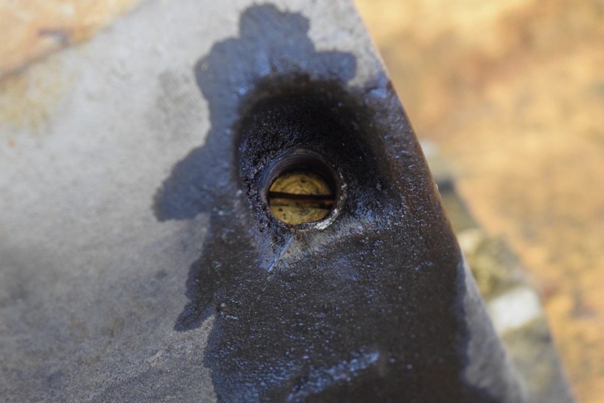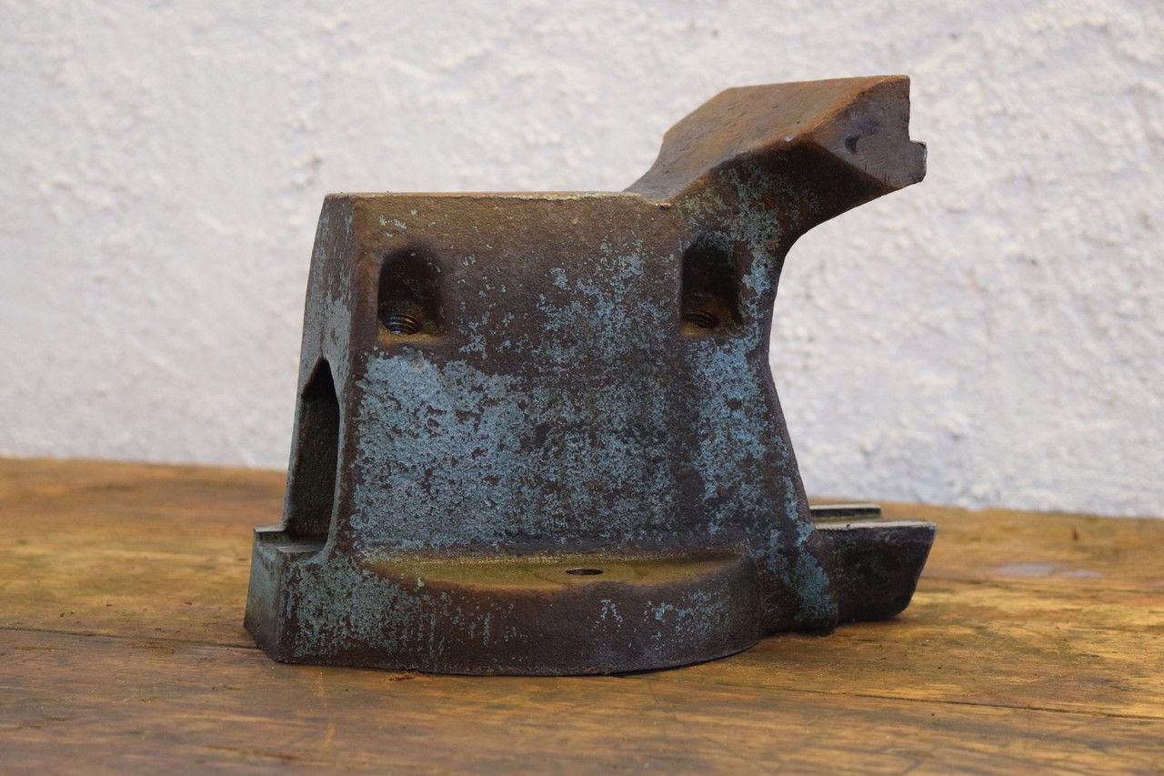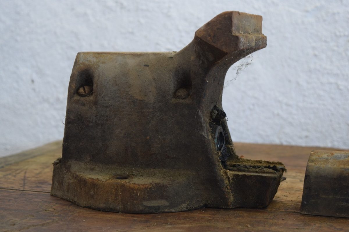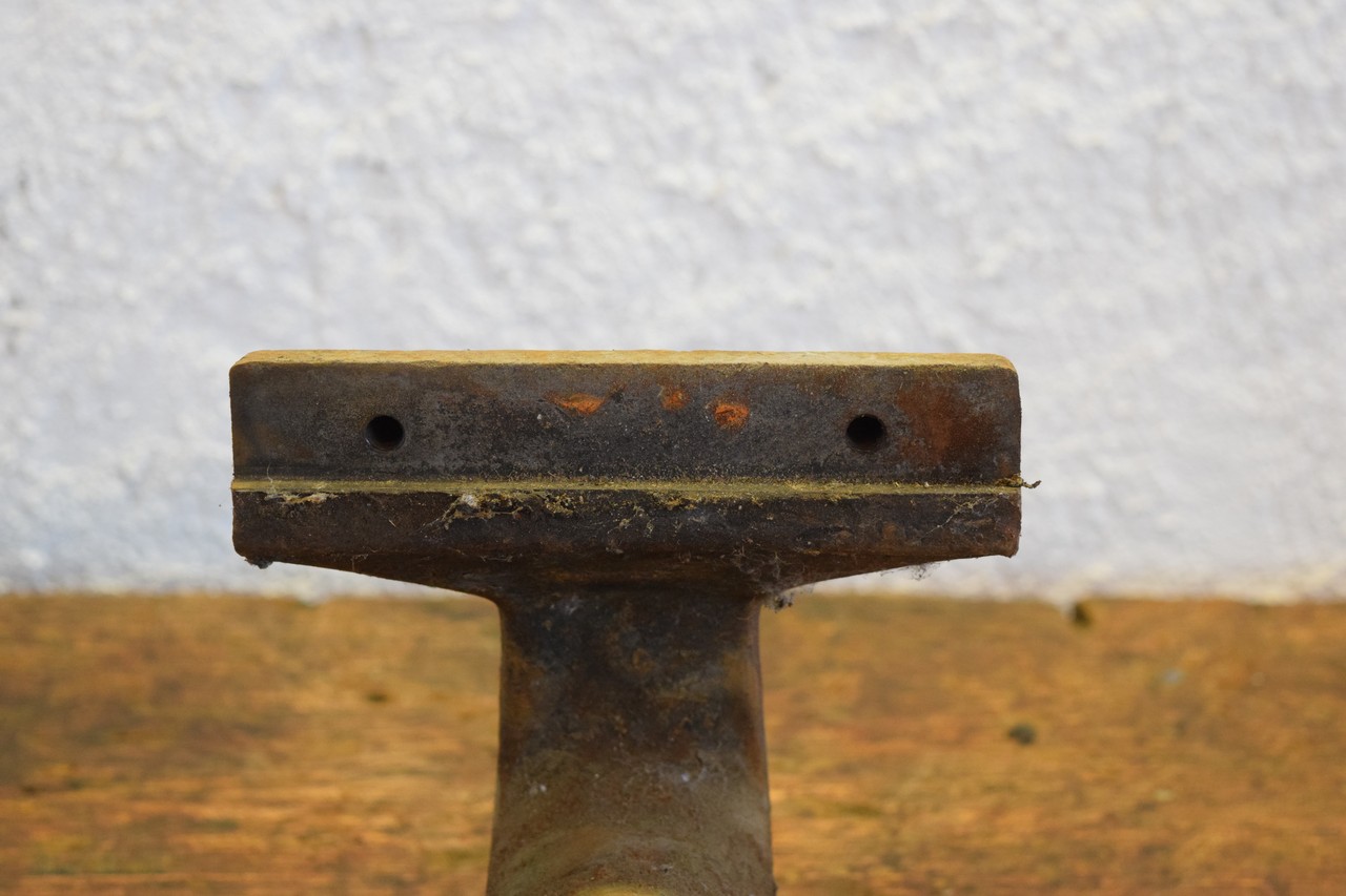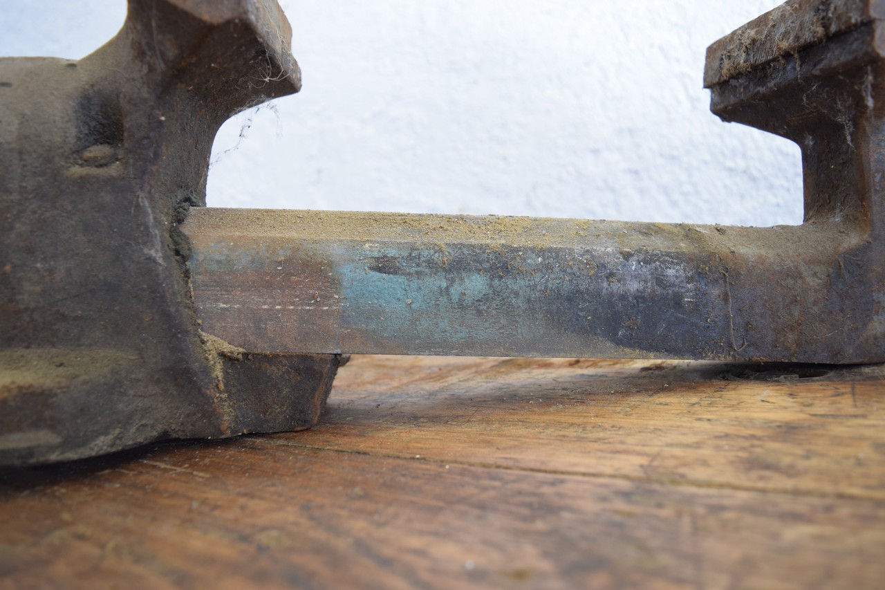 Il était recouvert d’une bonne couche de cambouis, qui l’a en partie préservé de la rouille. Malgré cela, toute la partie haute de l’étau, et notamment l’enclume, est piquée par la corrosion.