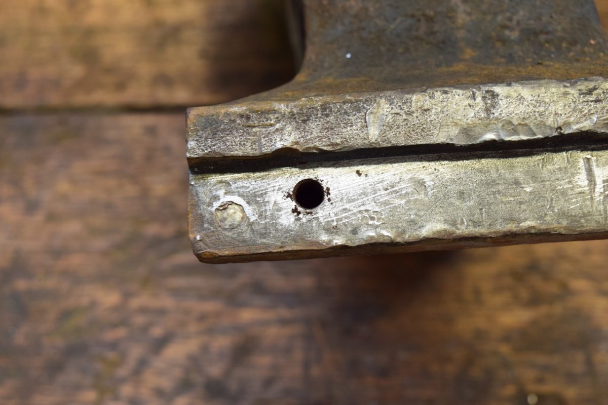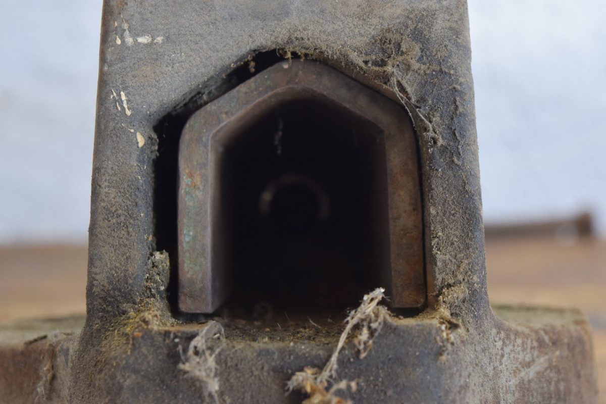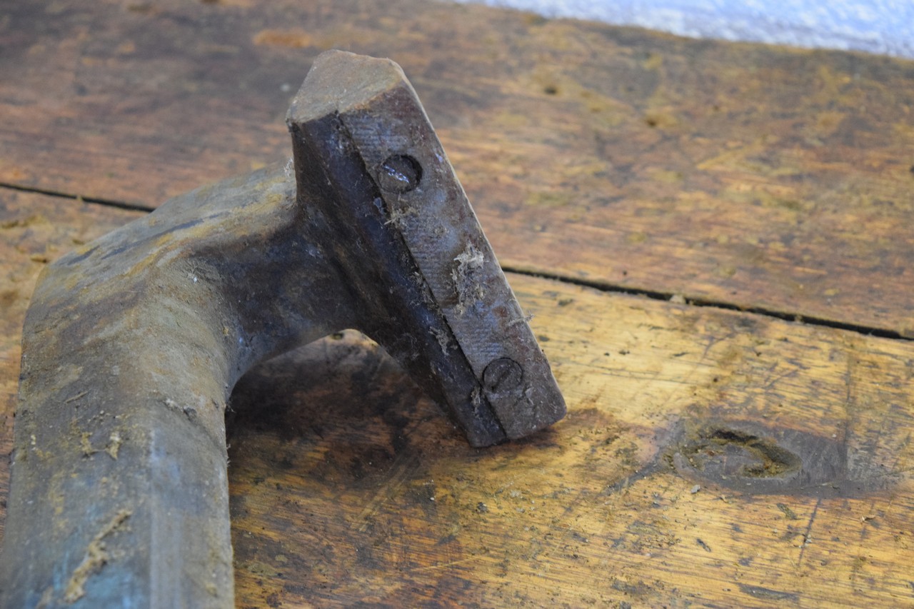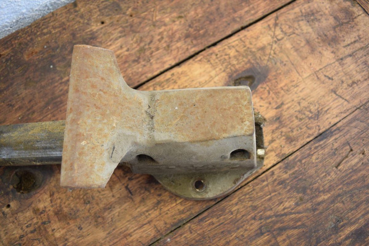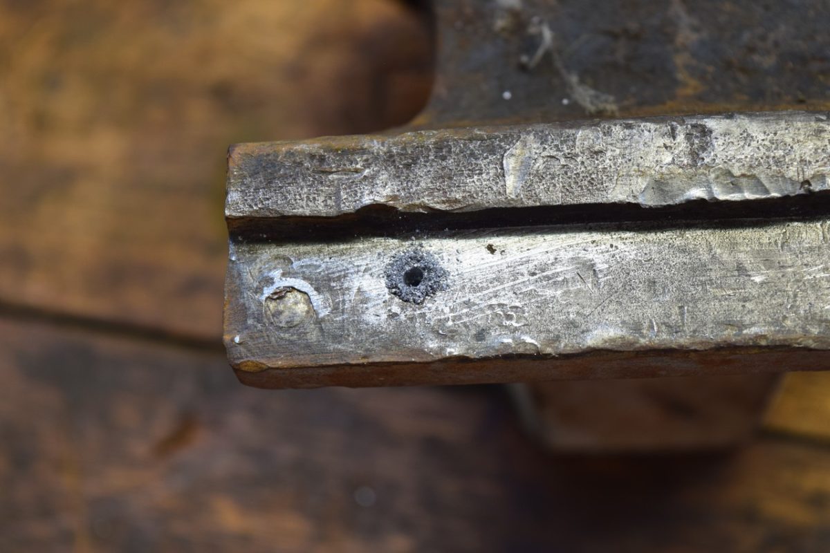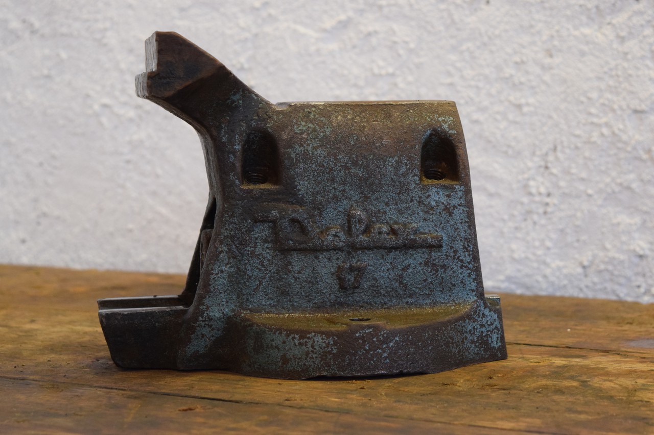 Il était recouvert d’une bonne couche de cambouis, qui l’a en partie préservé de la rouille. Malgré cela, toute la partie haute de l’étau, et notamment l’enclume, est piquée par la corrosion.