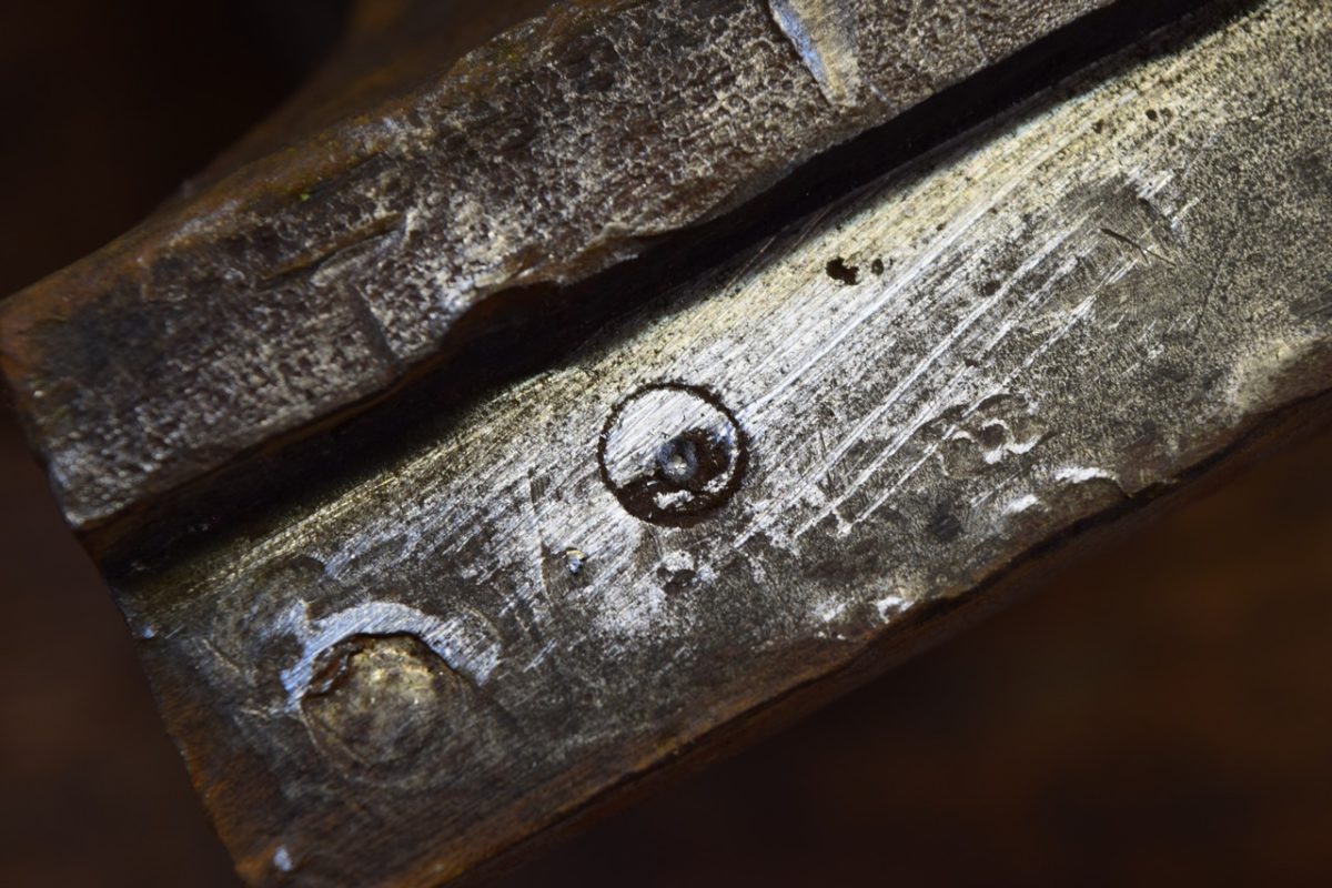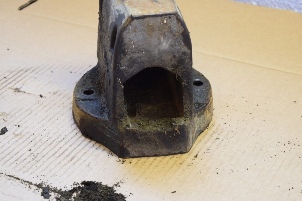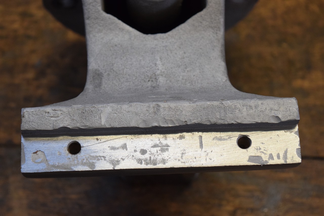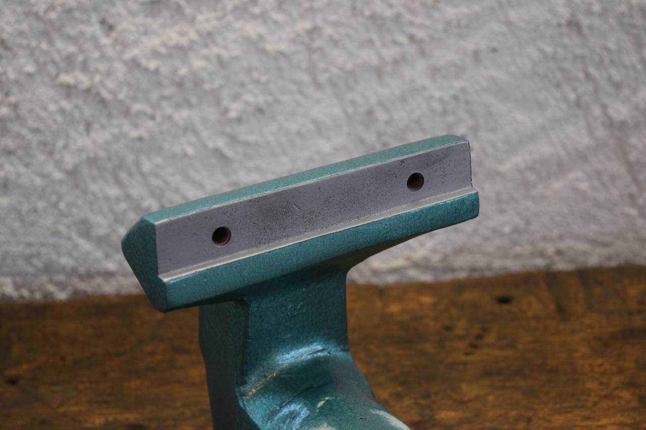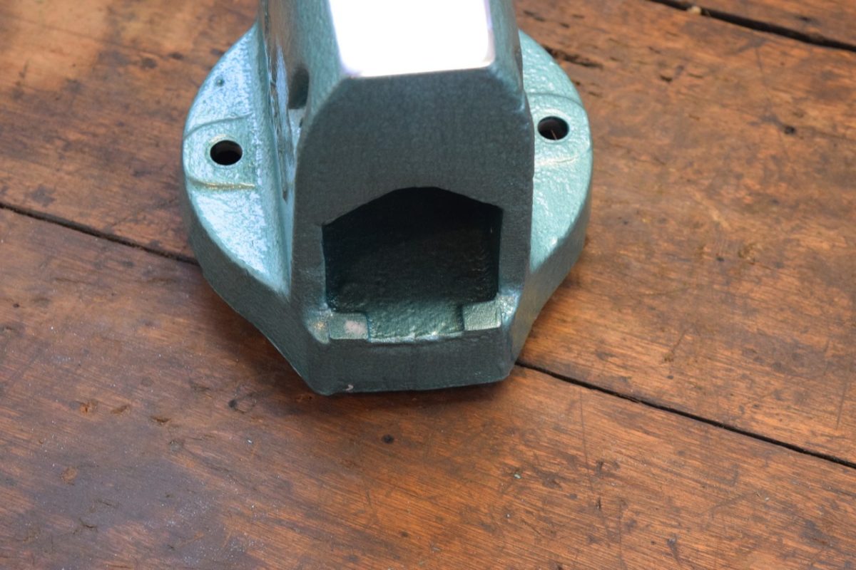 Il était recouvert d’une bonne couche de cambouis, qui l’a en partie préservé de la rouille. Malgré cela, toute la partie haute de l’étau, et notamment l’enclume, est piquée par la corrosion.