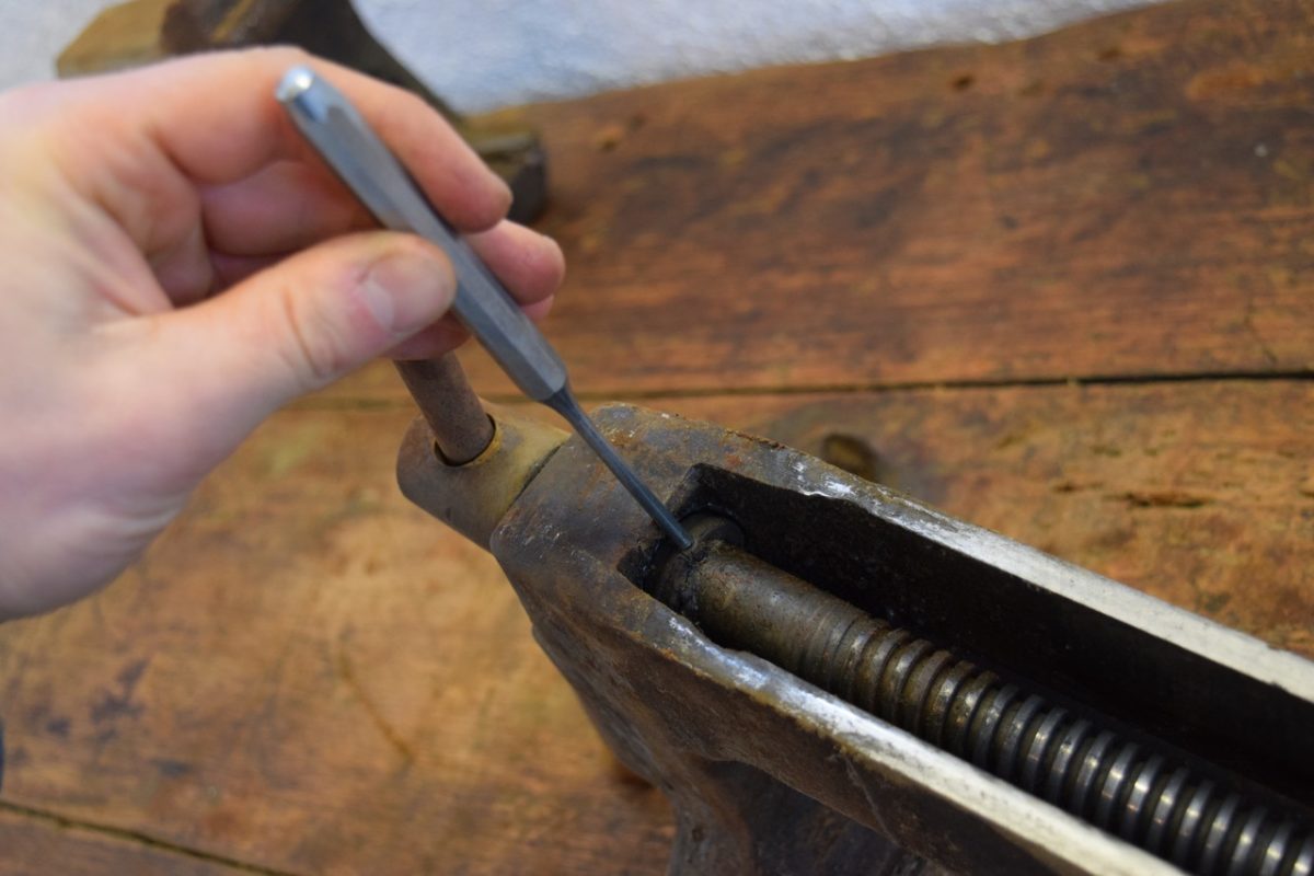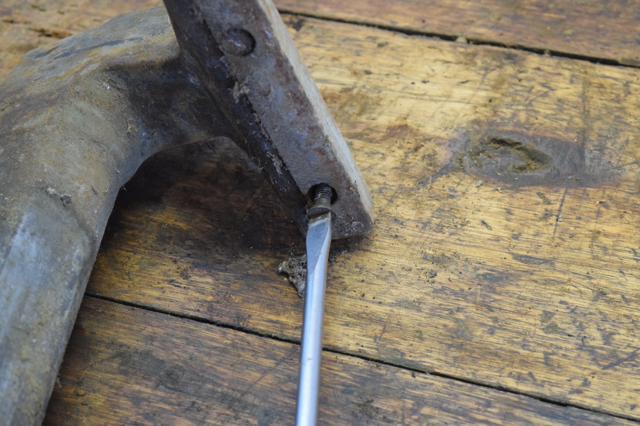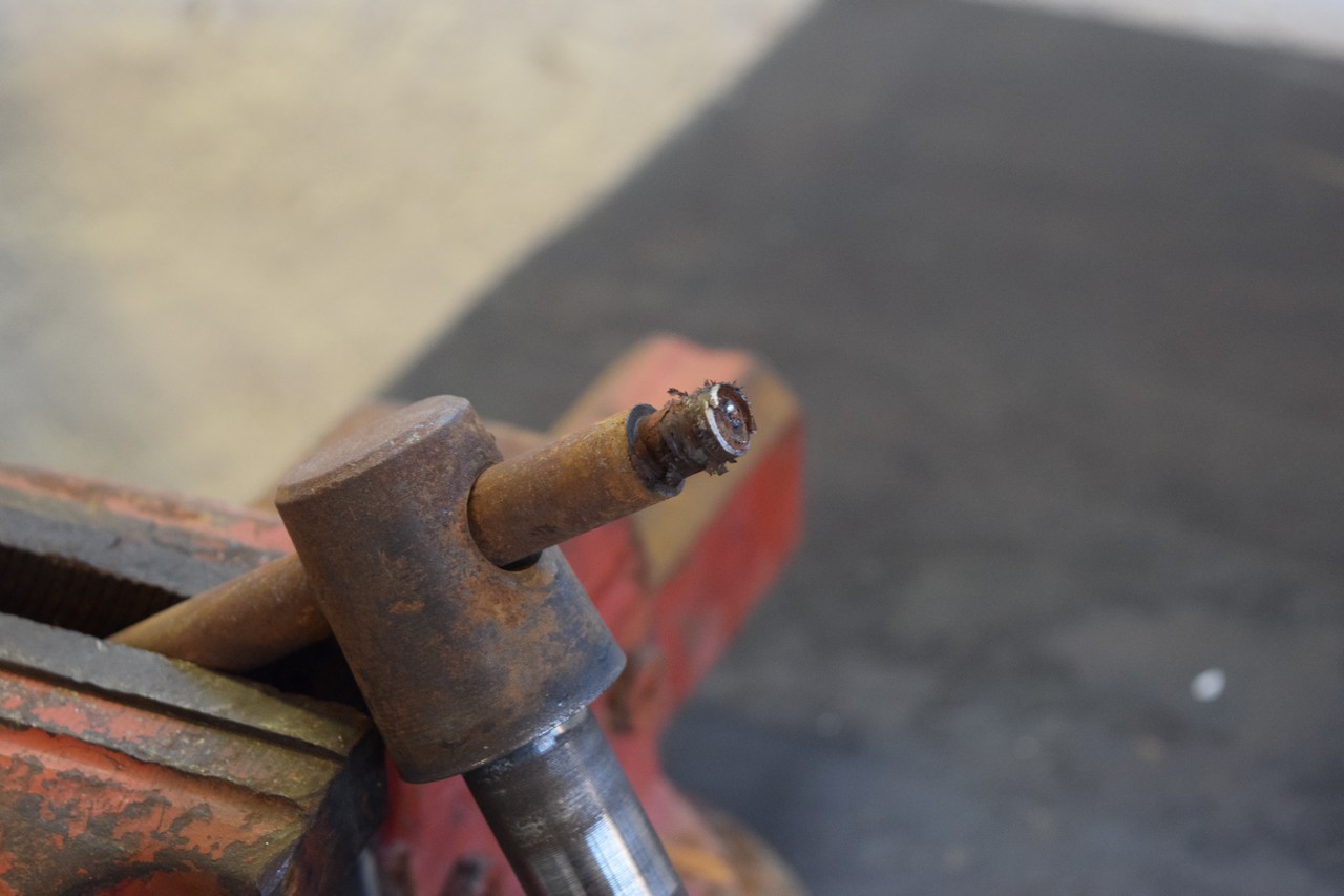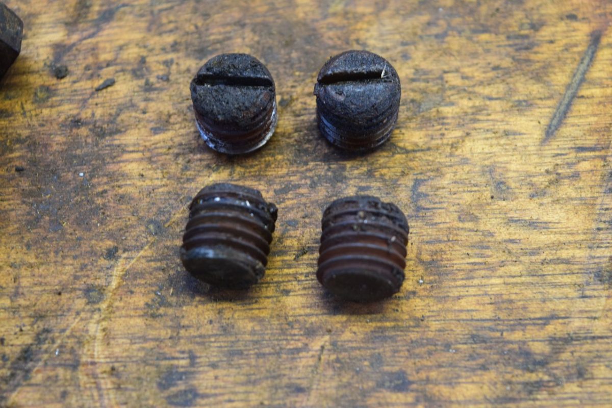 On passe maintenant à l’extraction des vis de réglages. L’étau n’ayant pas été utilisé (et encore moins réglé) depuis longtemps, la plupart sont bloquées.