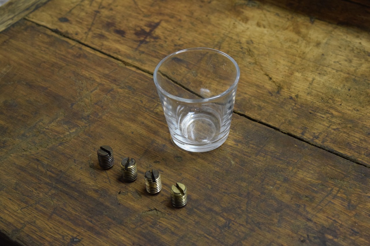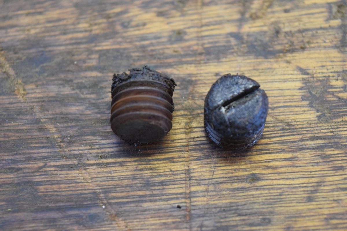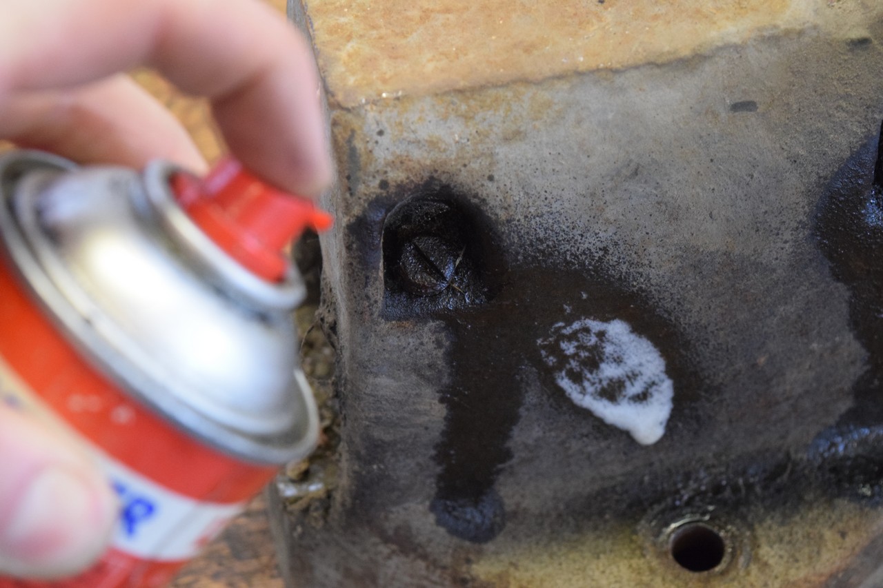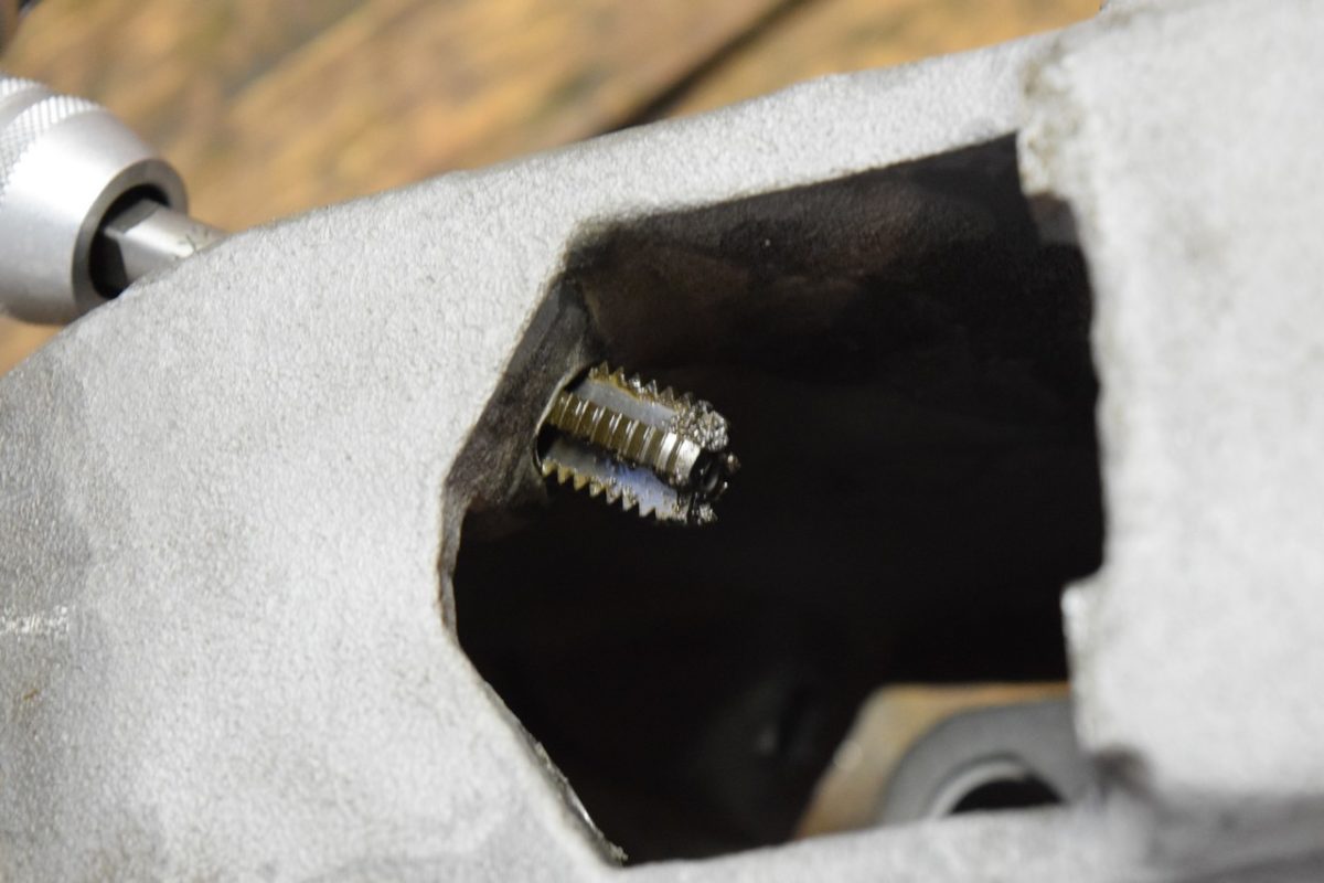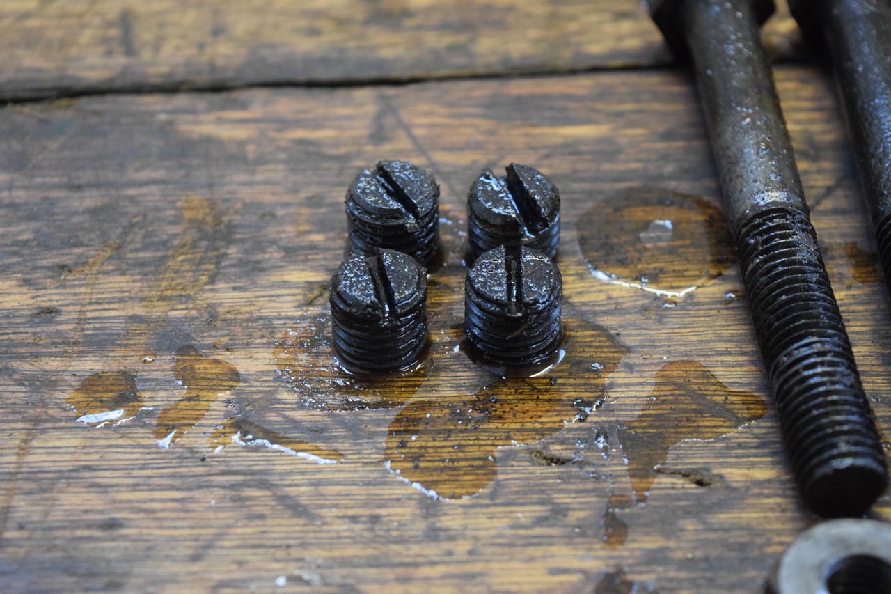On passe maintenant à l’extraction des vis de réglages. L’étau n’ayant pas été utilisé (et encore moins réglé) depuis longtemps, la plupart sont bloquées.