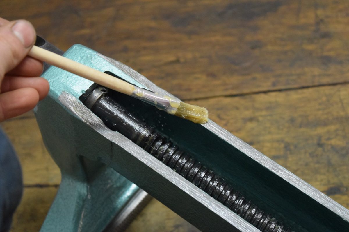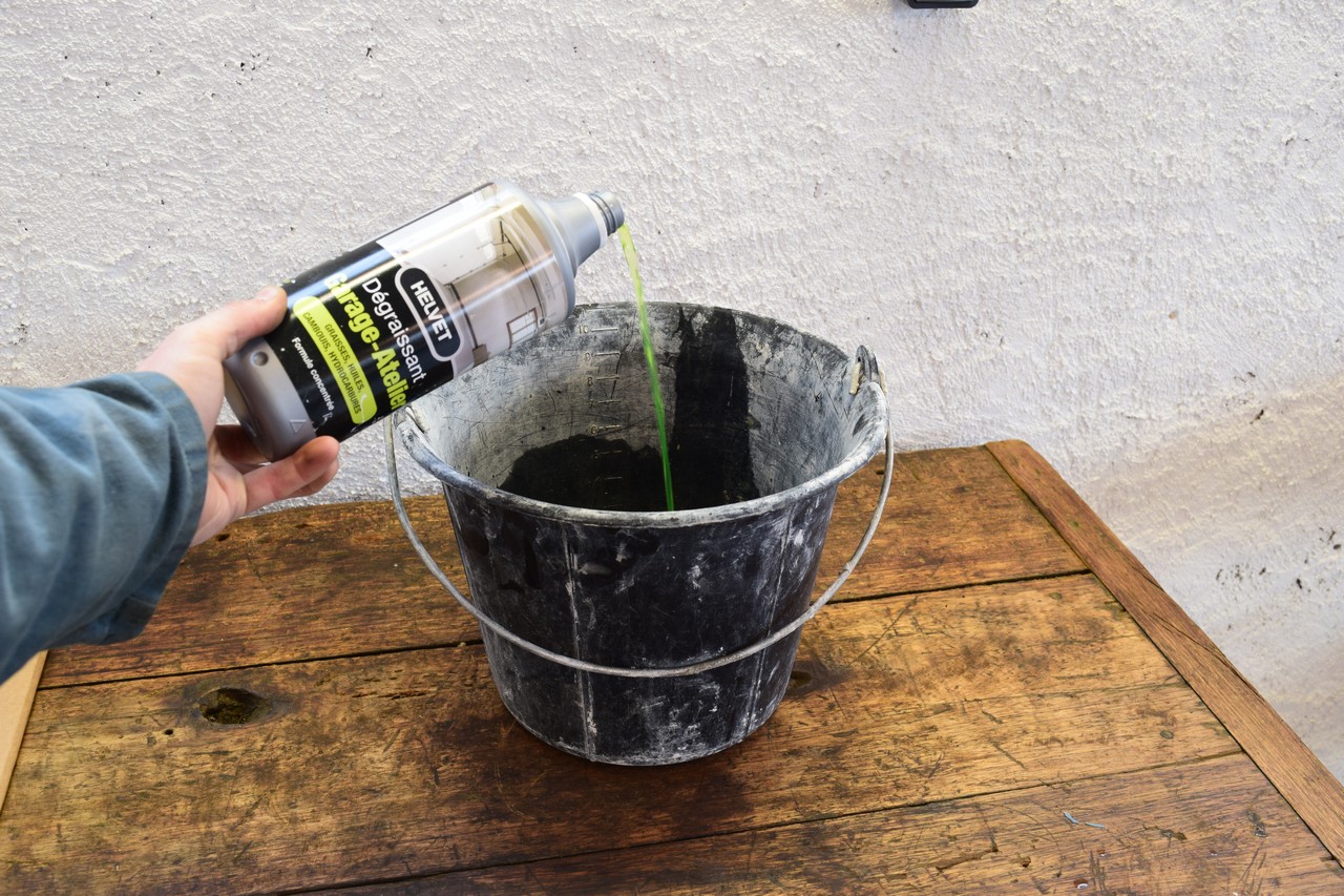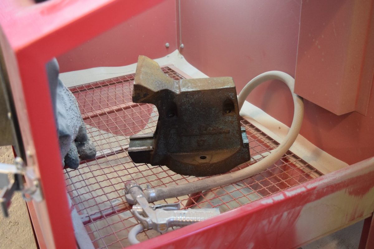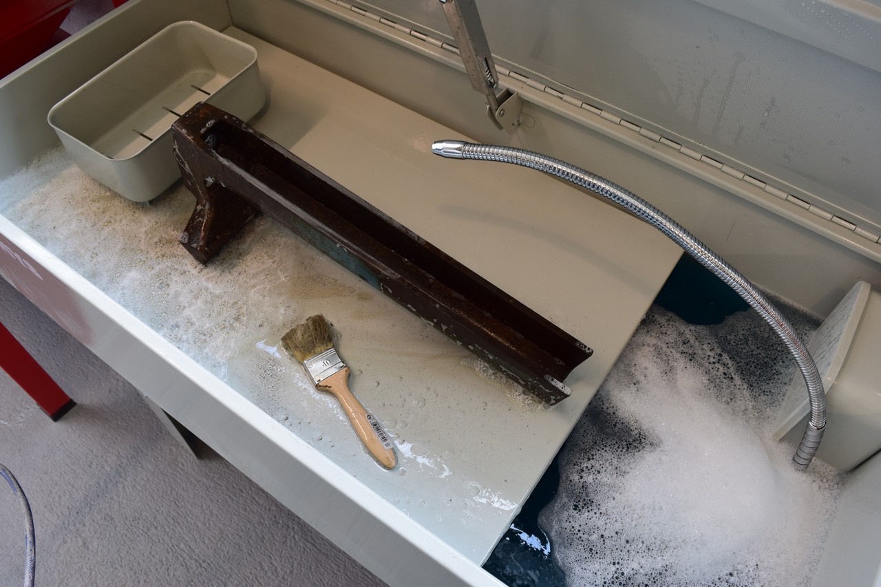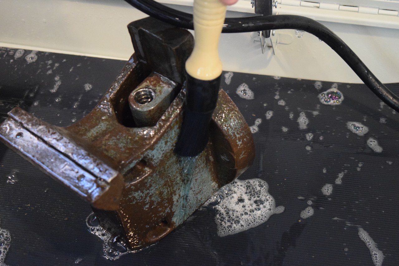 L’étau va être entièrement sablé. Pour ça, il ne doit plus rester la moindre trace de gras. C’est parti pour un bon dégraissage !