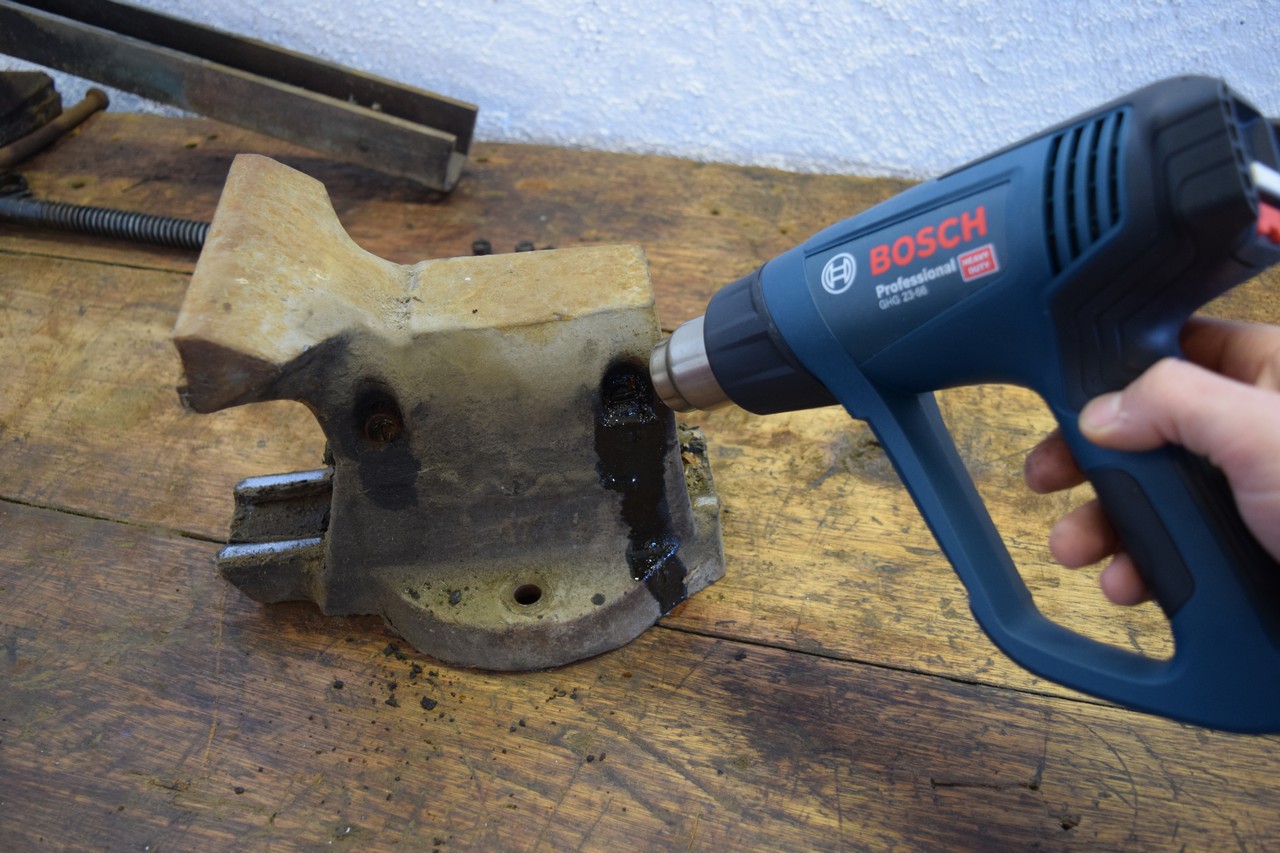 Je commence par gratter la bonne couche de cambouis qui se trouve sur l’étau.