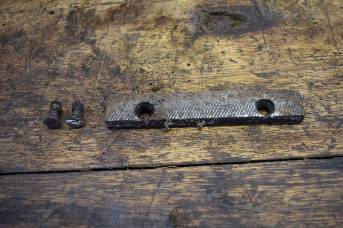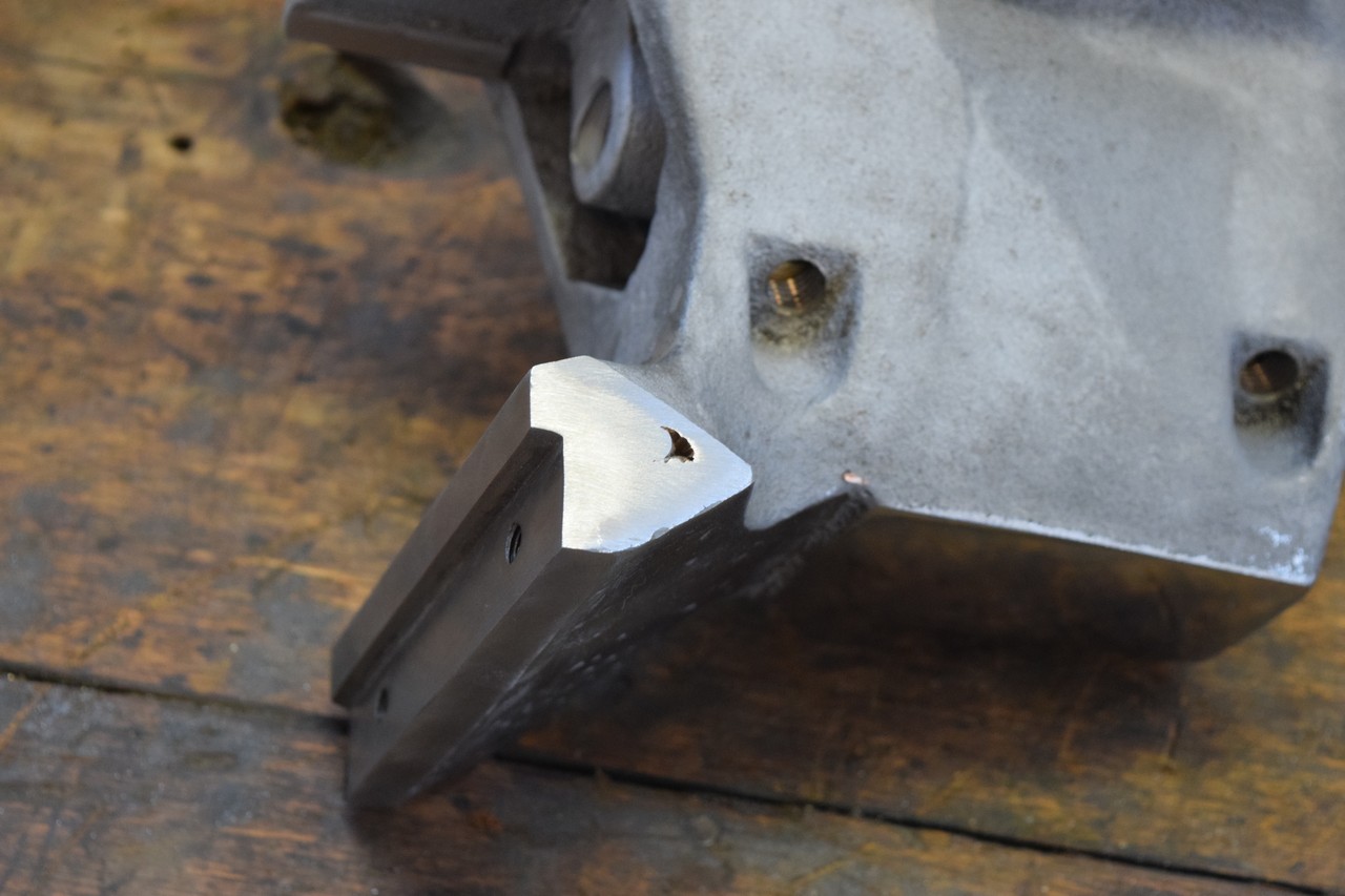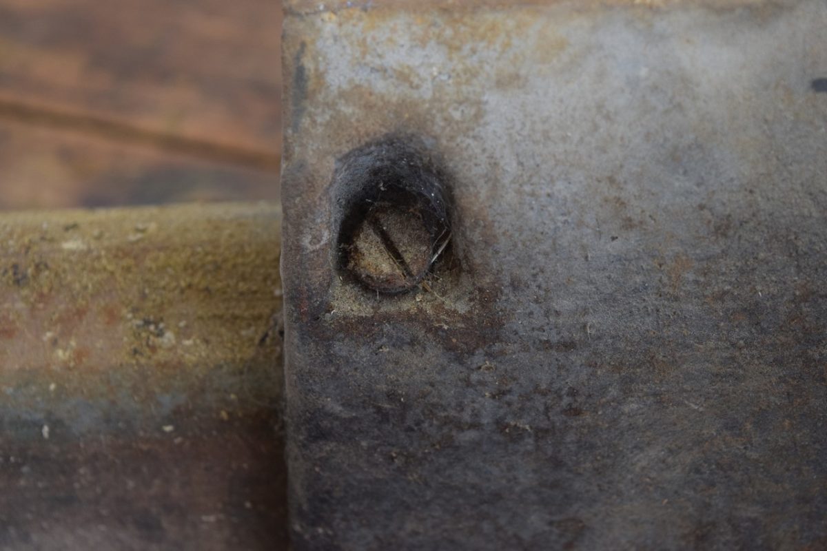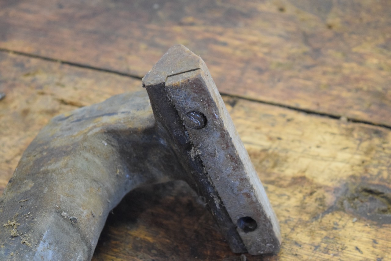 Concernant les mors de l’étau, il ne restait que celui sur la partie mobile, et son état montre que l’étau a été utilisé intensivement dans le passé ! Au niveau de la partie fixe, pas de mors, et les deux vis de fixations sont cassées à ras dans l’étau…