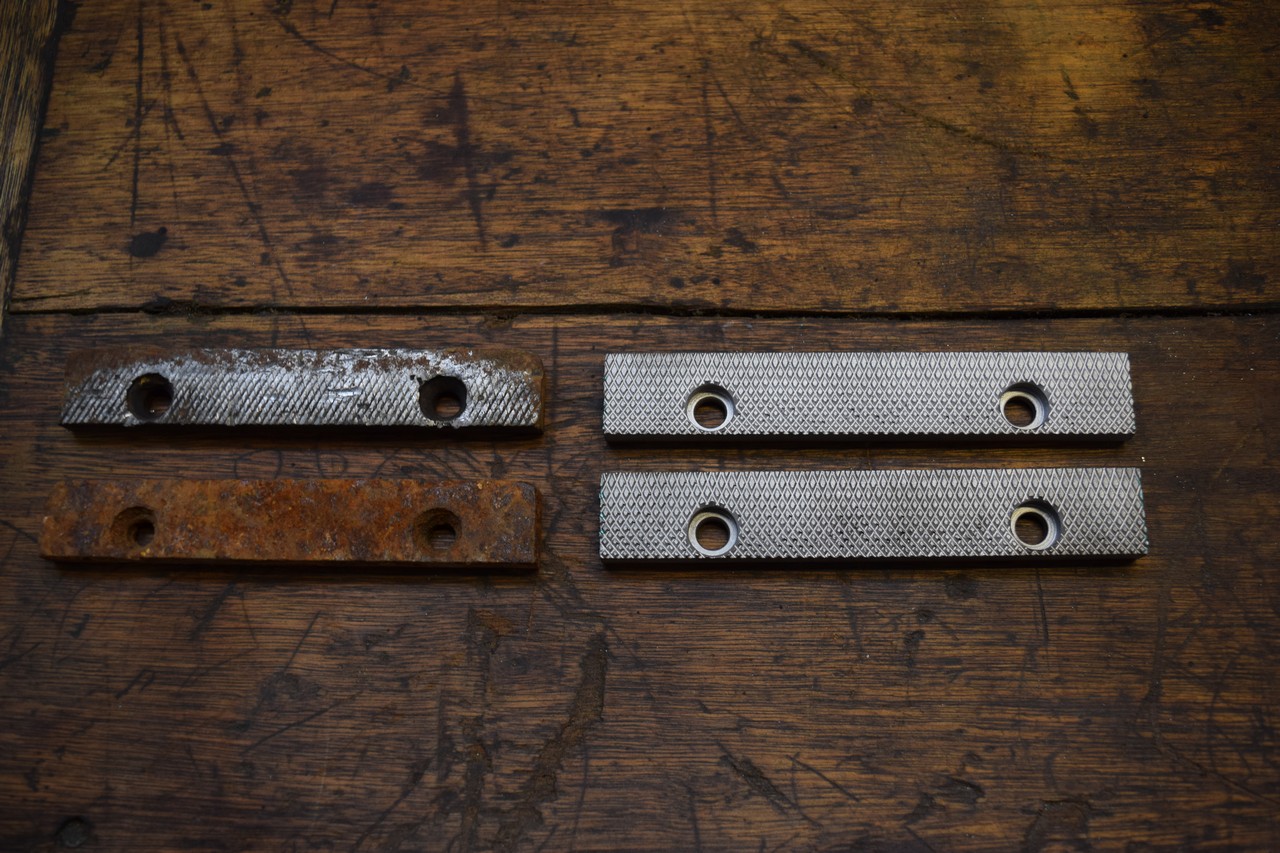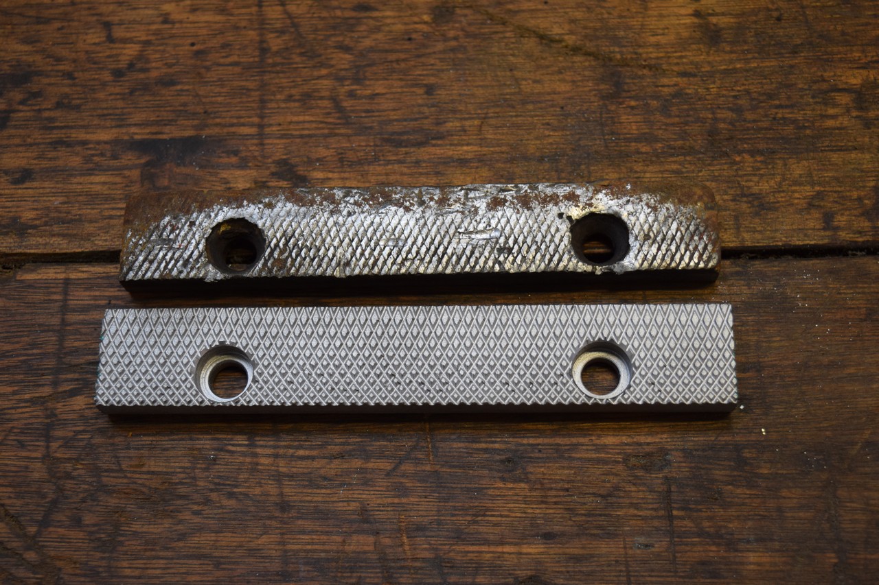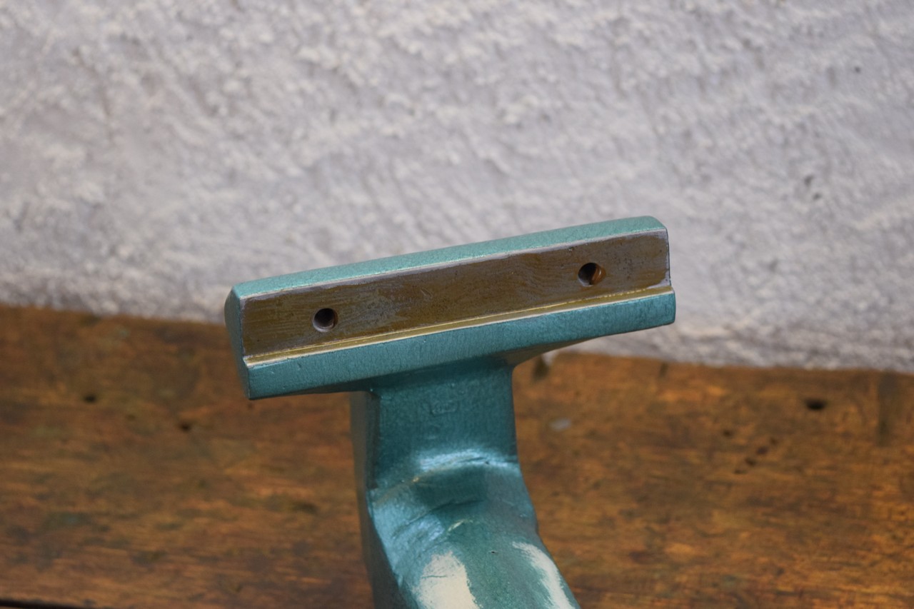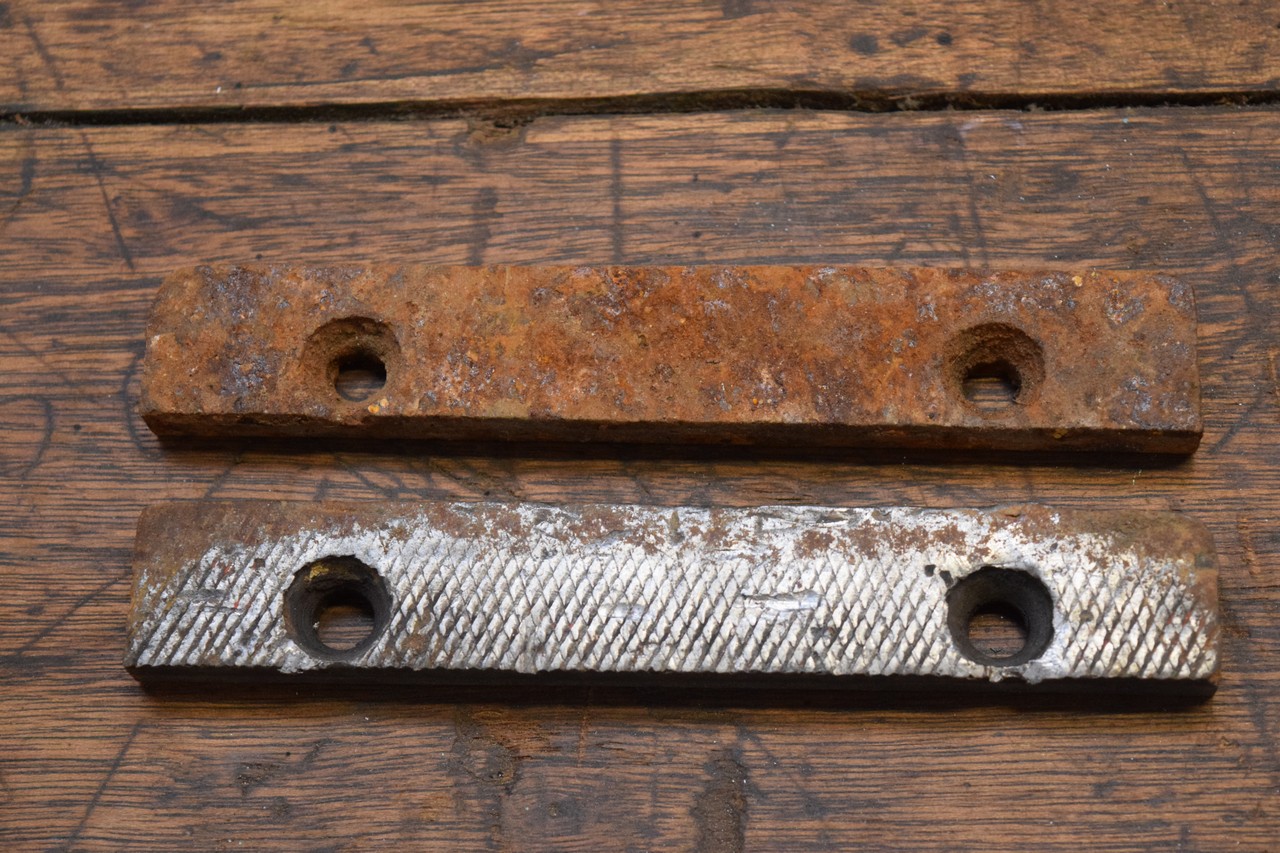 Concernant les mors de l’étau, il ne restait que celui sur la partie mobile, et son état montre que l’étau a été utilisé intensivement dans le passé ! Au niveau de la partie fixe, pas de mors, et les deux vis de fixations sont cassées à ras dans l’étau…