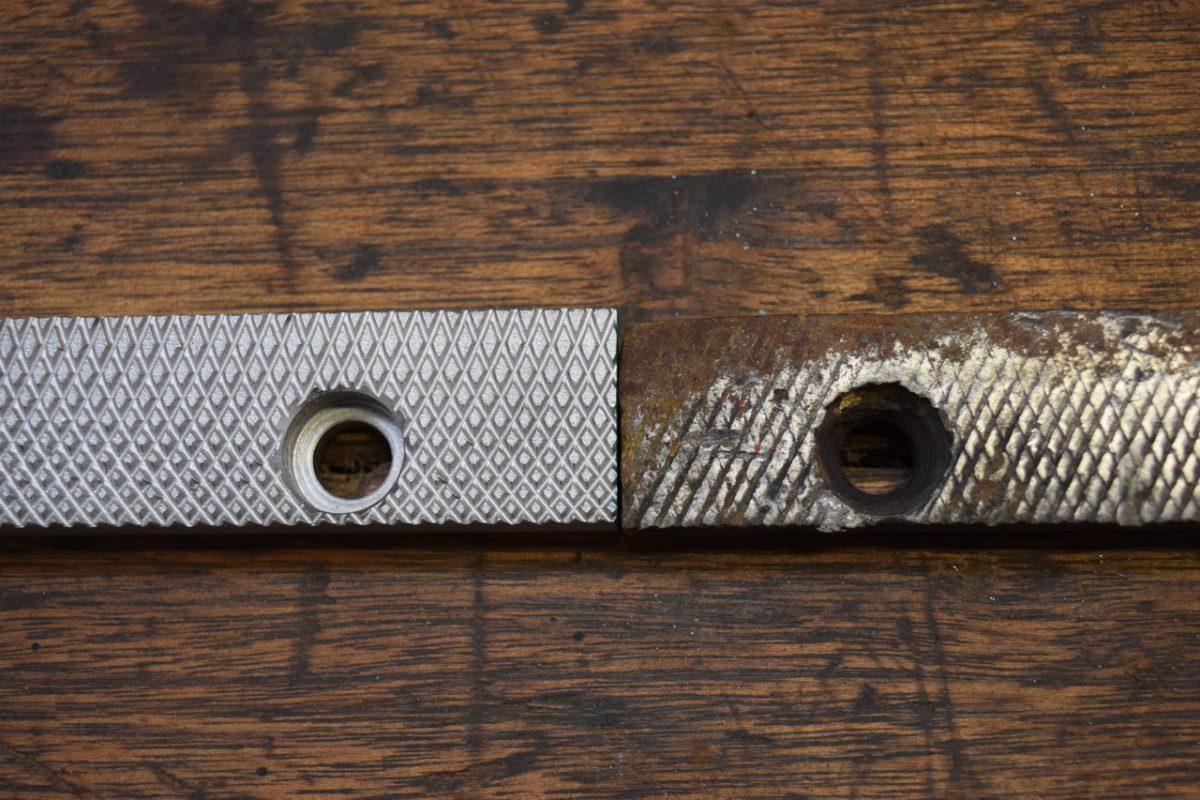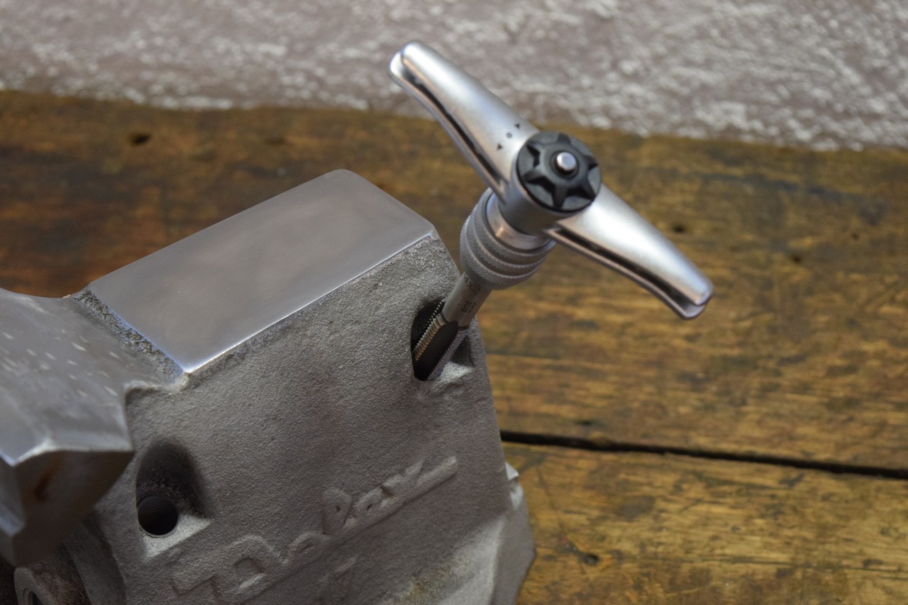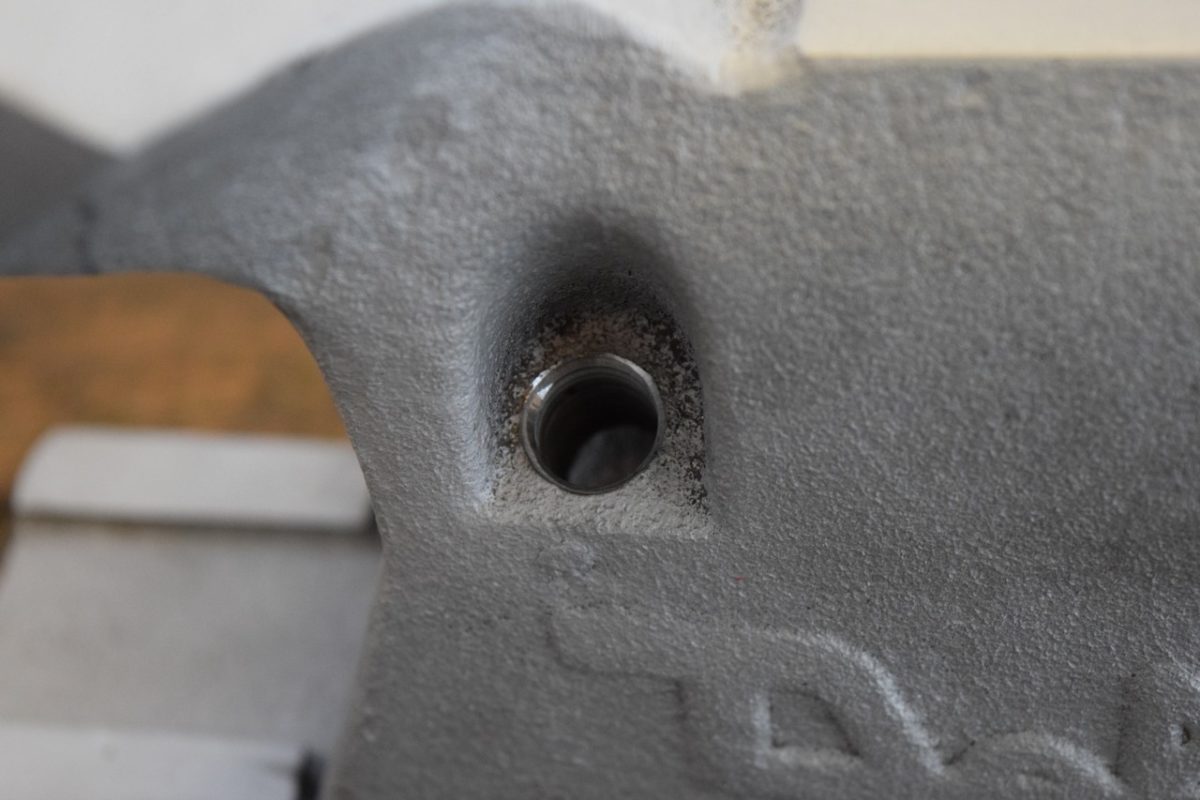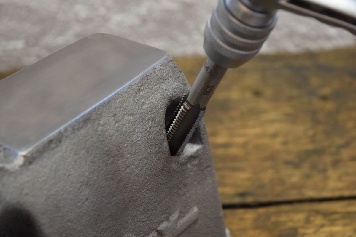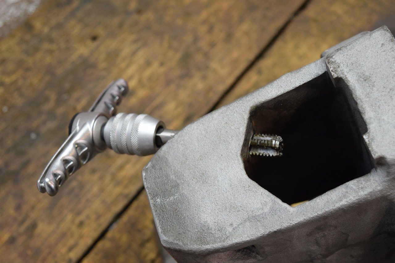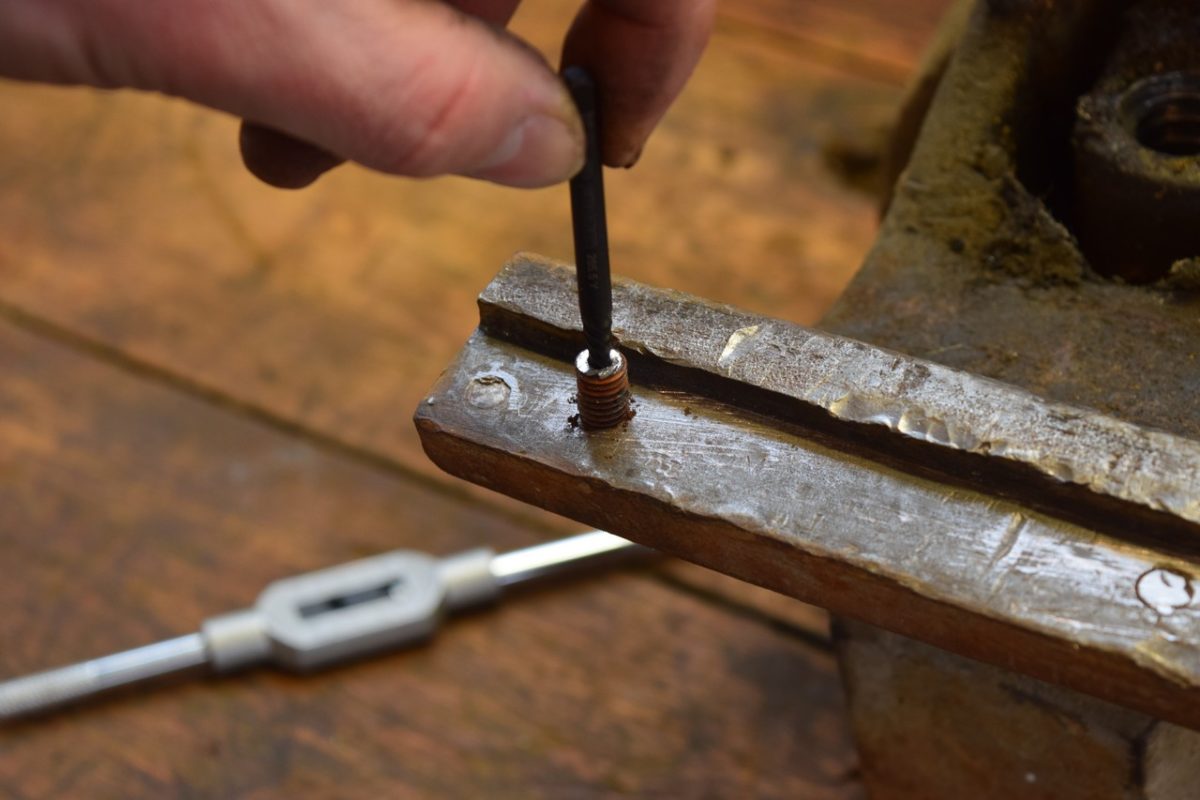 Les vis grippées ont fait souffrir les taraudages de l’étau, que ce soit au niveau des mors que des vis de réglages. Qui plus est, le sablage n’a rien arrangé en laissant de fine particules qui viennent s’incruster entre les filets. Un bon coup de taraud s’impose !