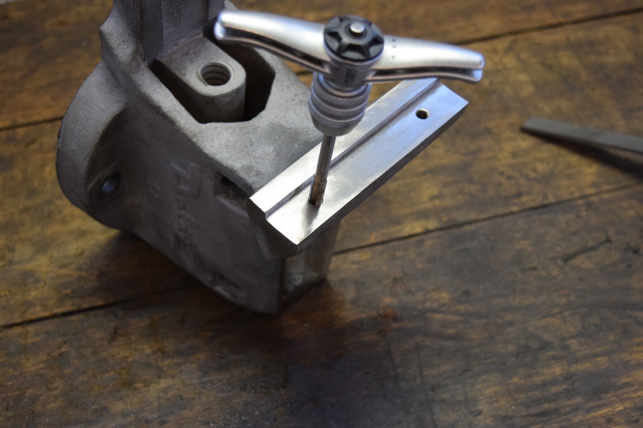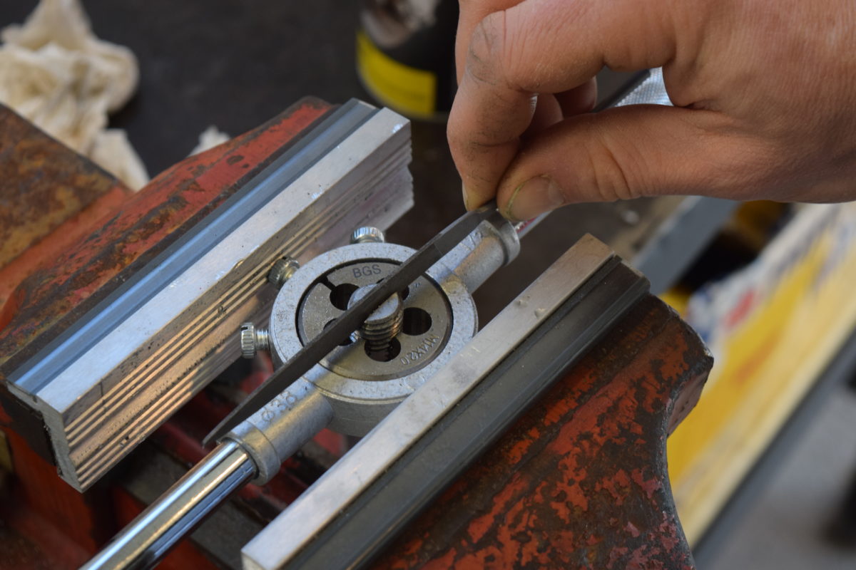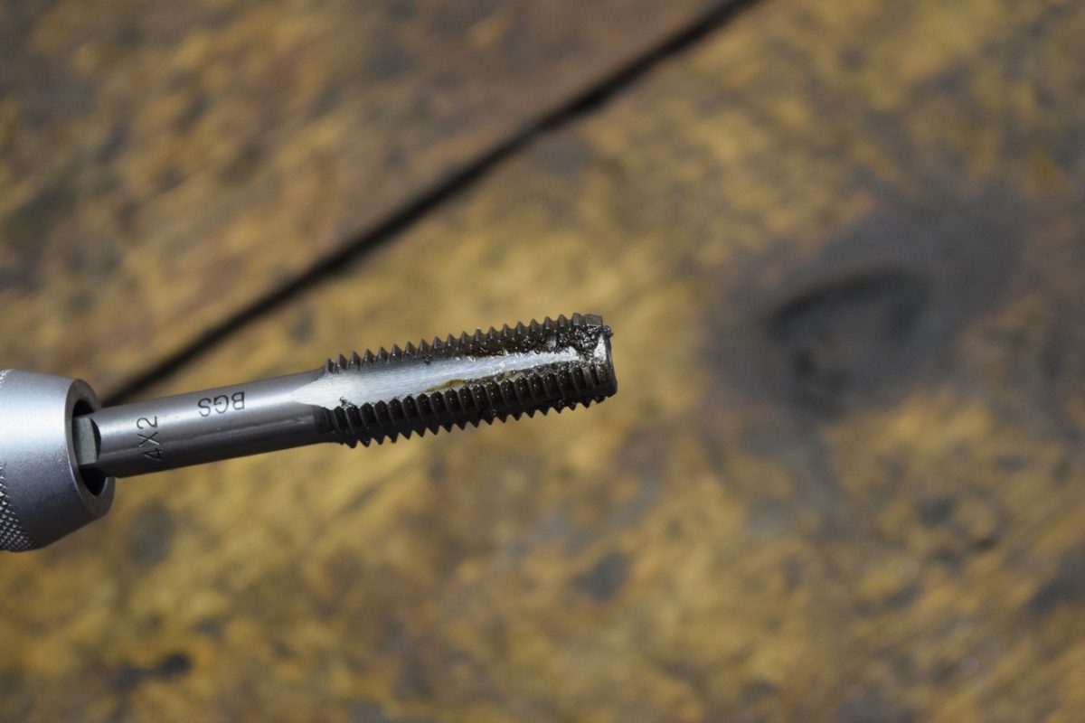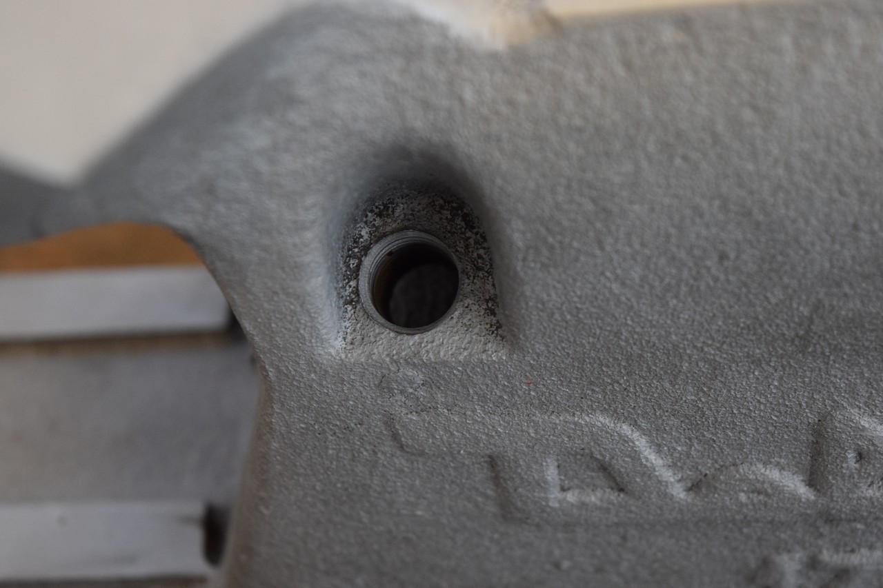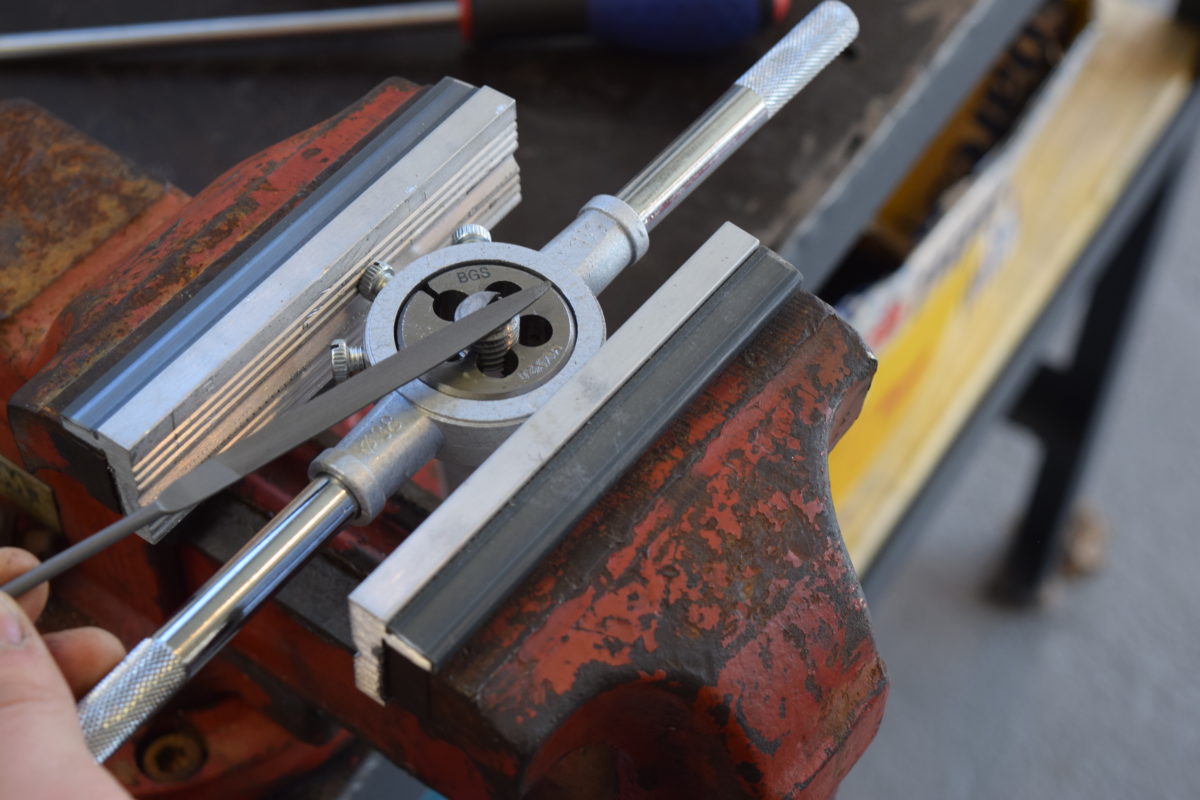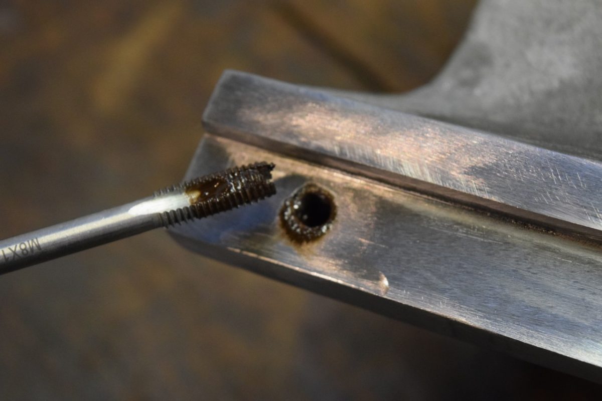 Les vis grippées ont fait souffrir les taraudages de l’étau, que ce soit au niveau des mors que des vis de réglages. Qui plus est, le sablage n’a rien arrangé en laissant de fine particules qui viennent s’incruster entre les filets. Un bon coup de taraud s’impose !