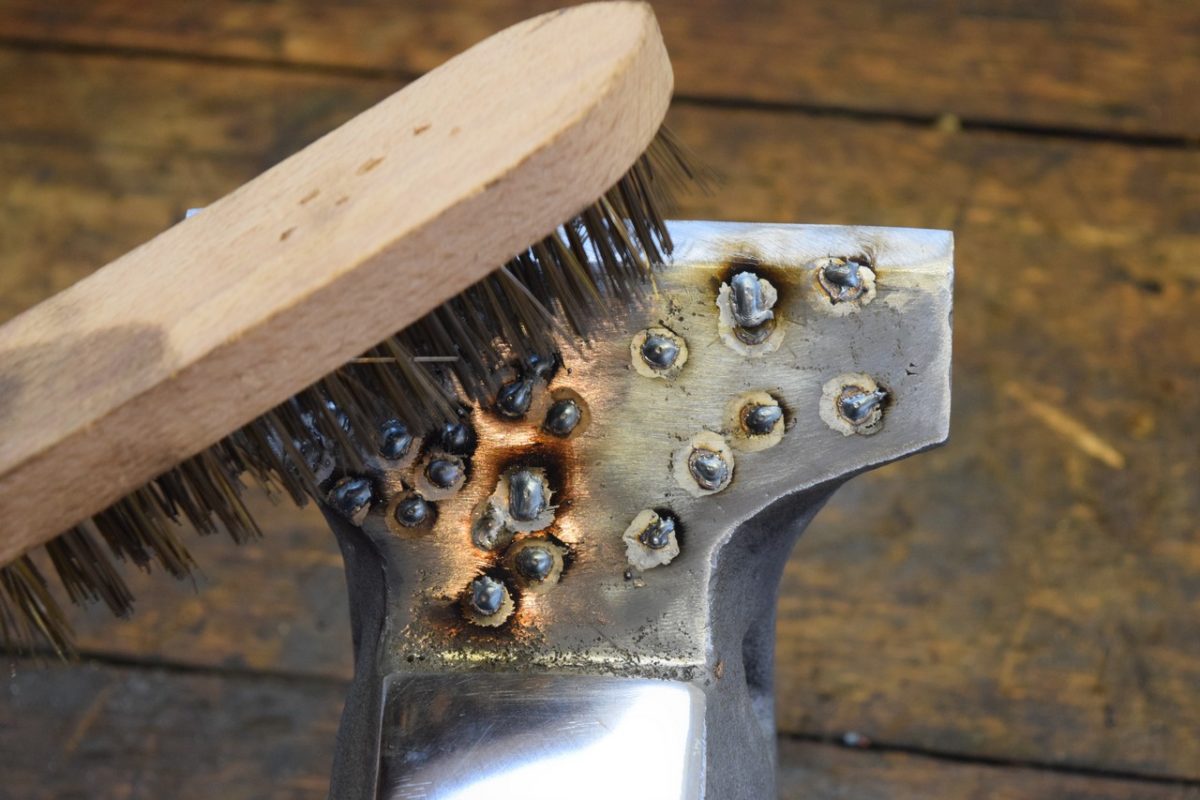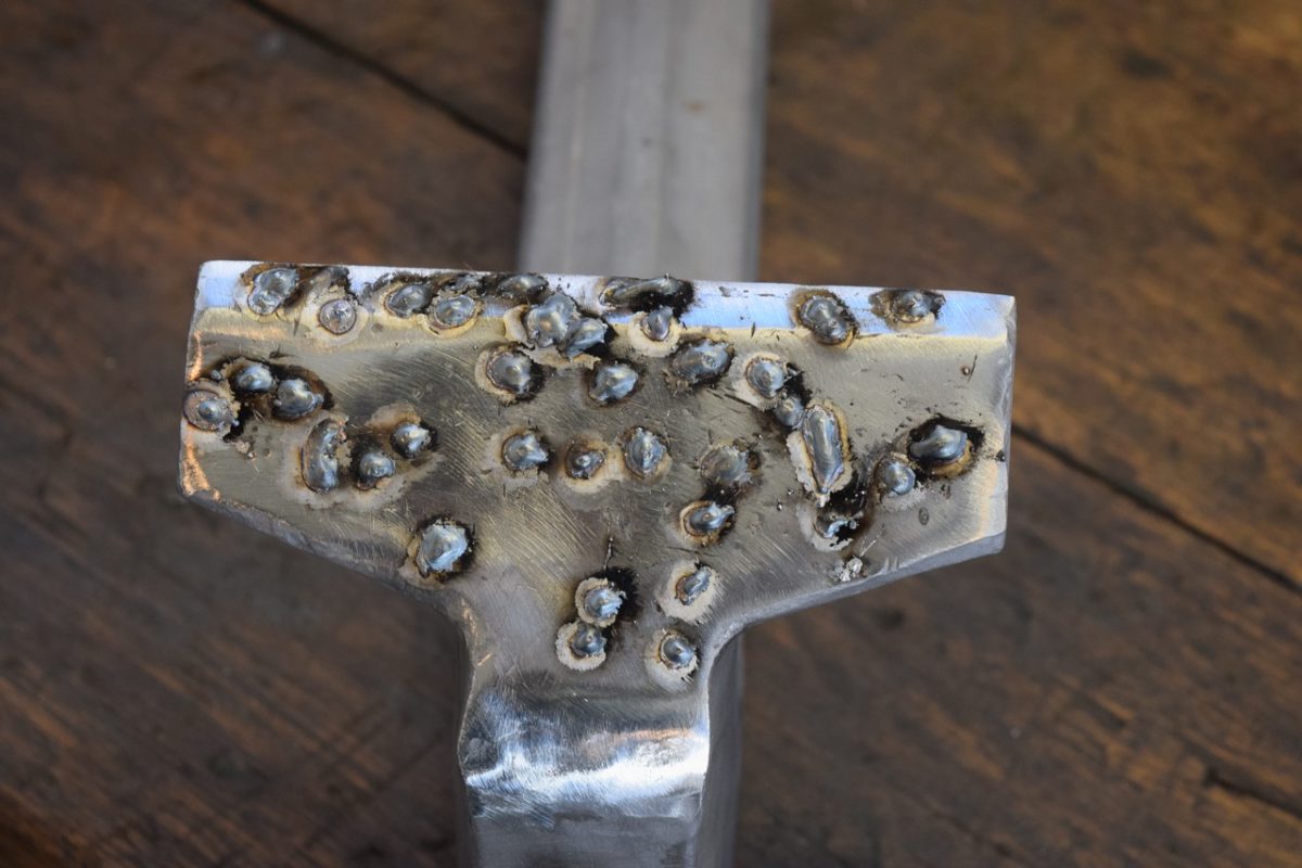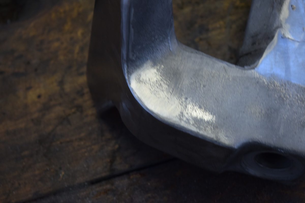 Je commence par enlever un peu de matière à l’aide d’un disque à décaper monter sur une meuleuse, puis, pour les défauts les plus profonds, je fais des points de soudure au MIG.