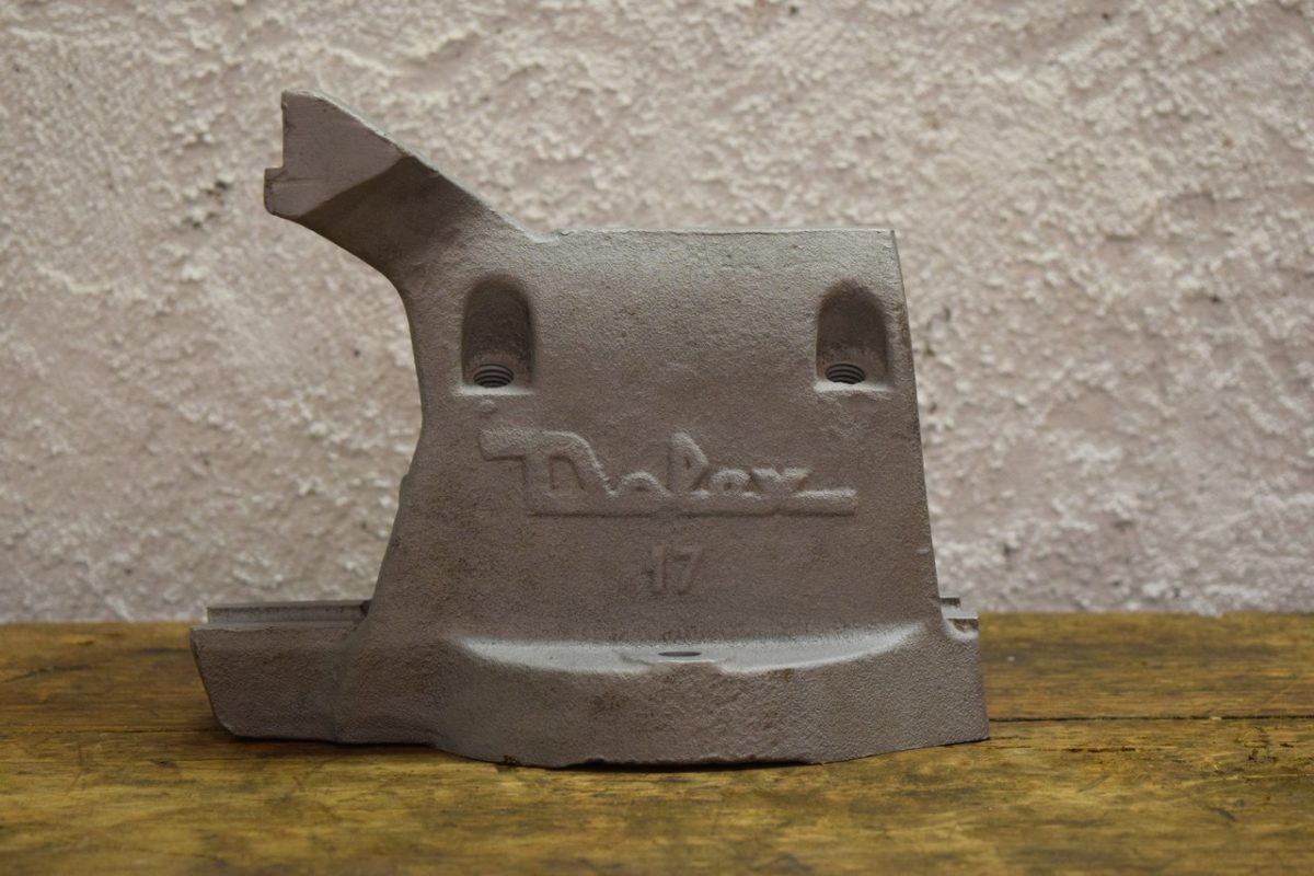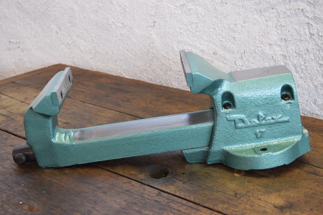 Il s’agit donc d’un étau de marque Dolex, référence 17. Ce modèle d’étau a été produit à partir des années 50 et arrêté dans les années 90. Les étaux Dolex sont réglables par un système de vis, permettant à la fois de régler le “parallélisme” des deux mors et le jeu entre la coulisse et la partie fixe.
