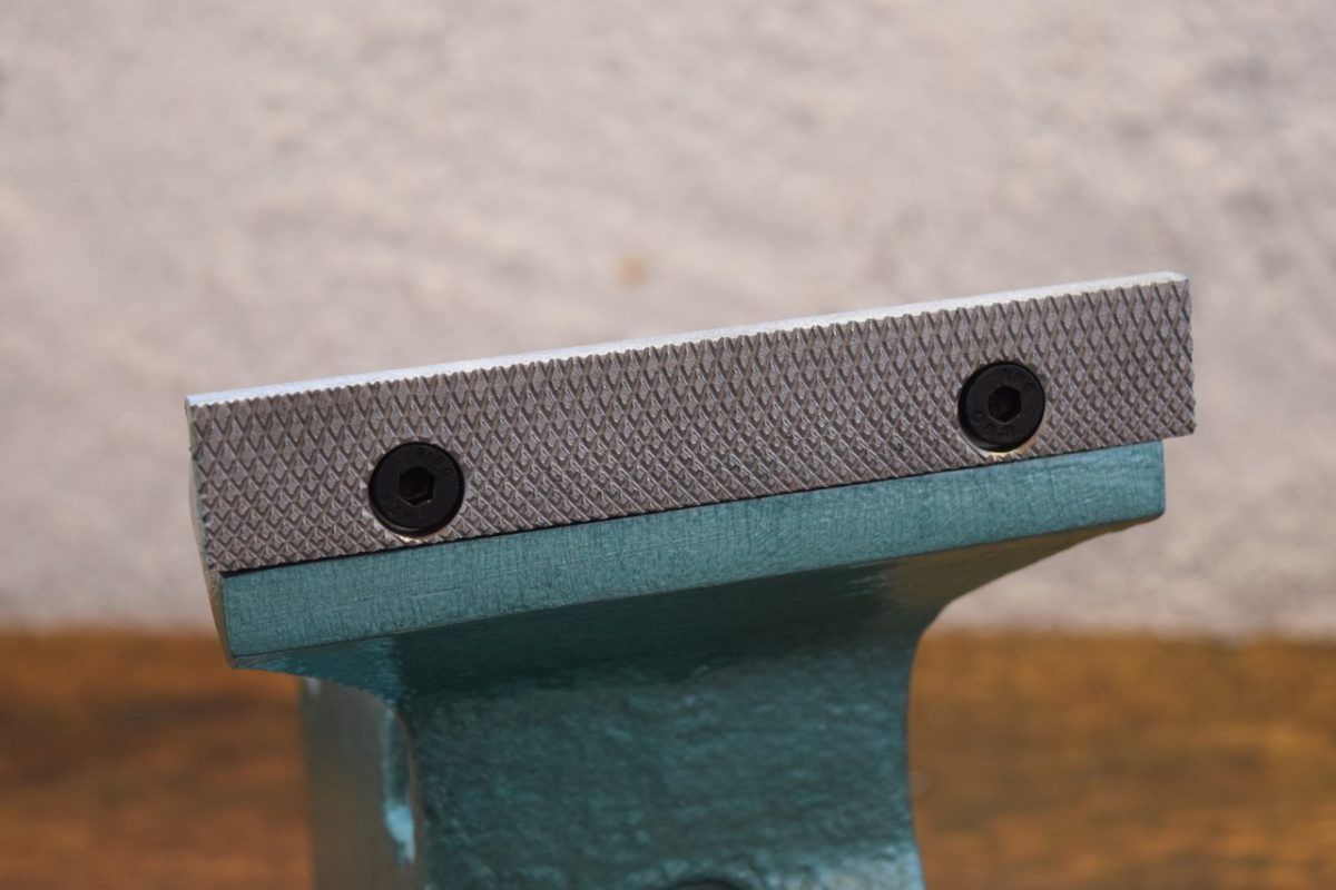 Il ne reste plus qu’un seul mord sur l’étau, celui de la partie mobile. Sur la partie fixe, le mord est absent et les vis de fixation cassées à ras.