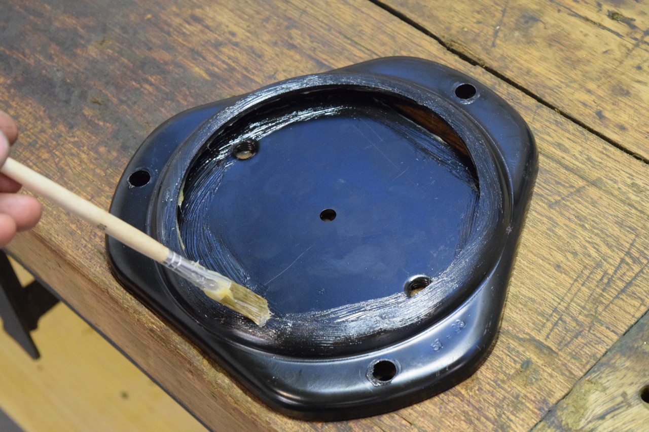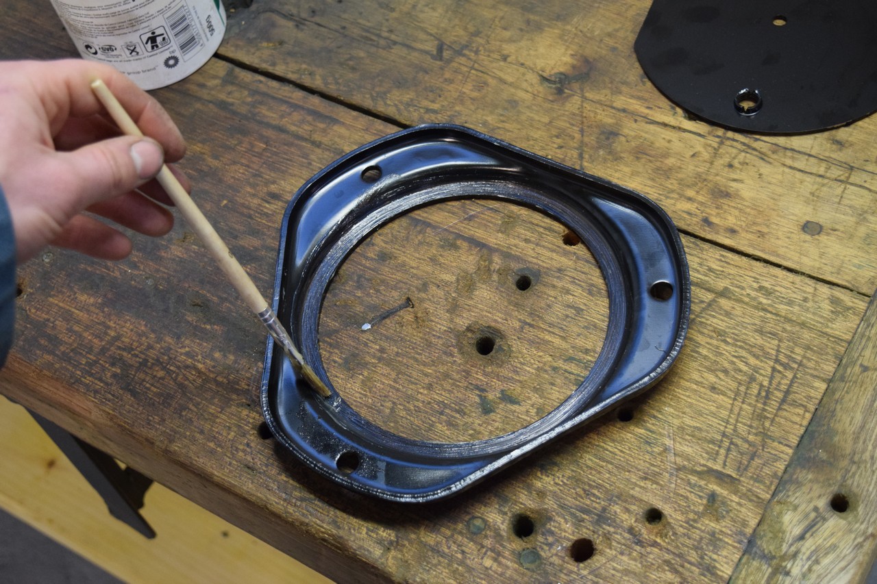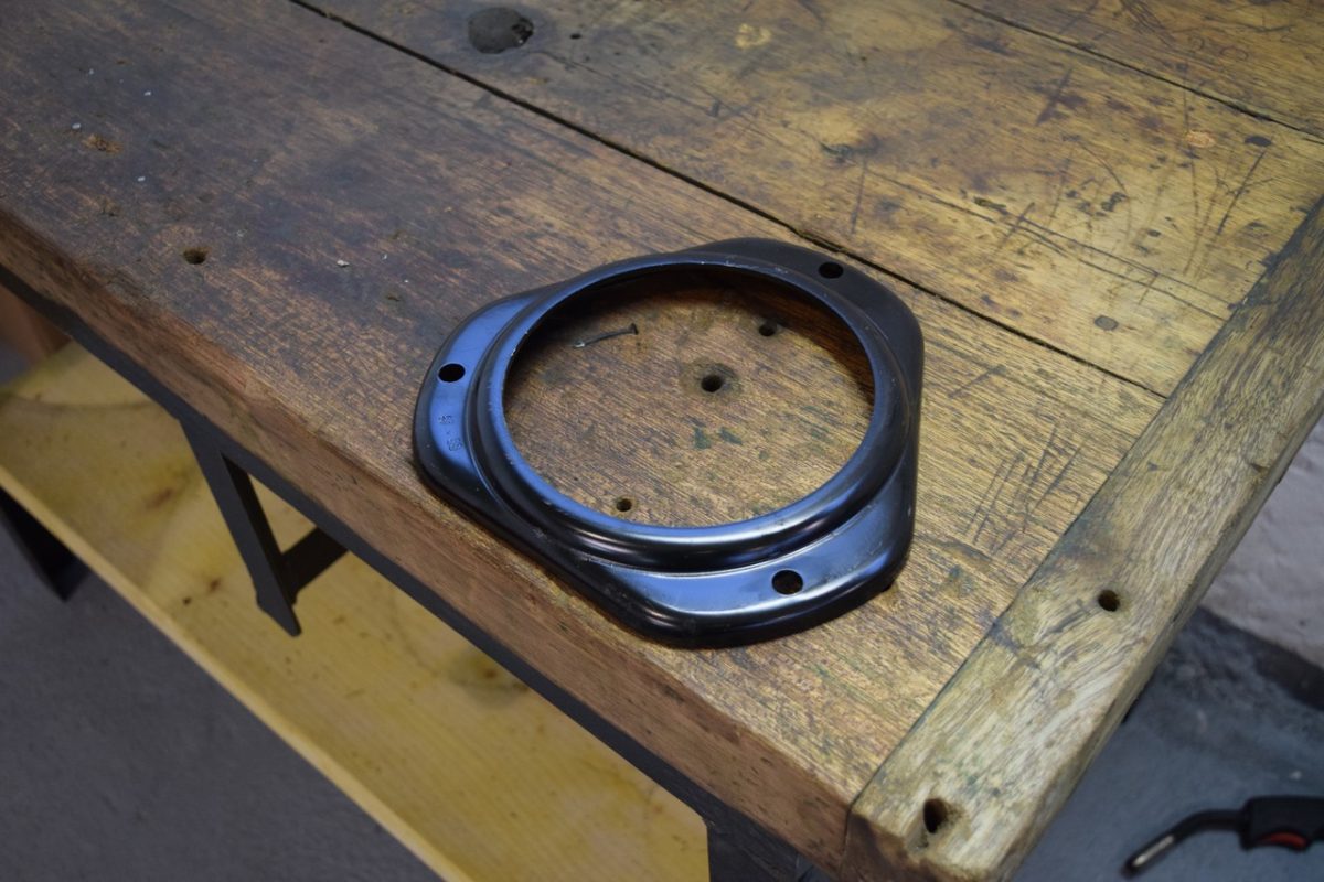 Quelques reprises à la lime ça et là, un polissage du tas auss, et je vais mastiquer au minimum avant peinture avec ce même vert jade martelé. Le mien avait d’ailleurs reçu une couche de noir dessus, probablement pas d’origine…