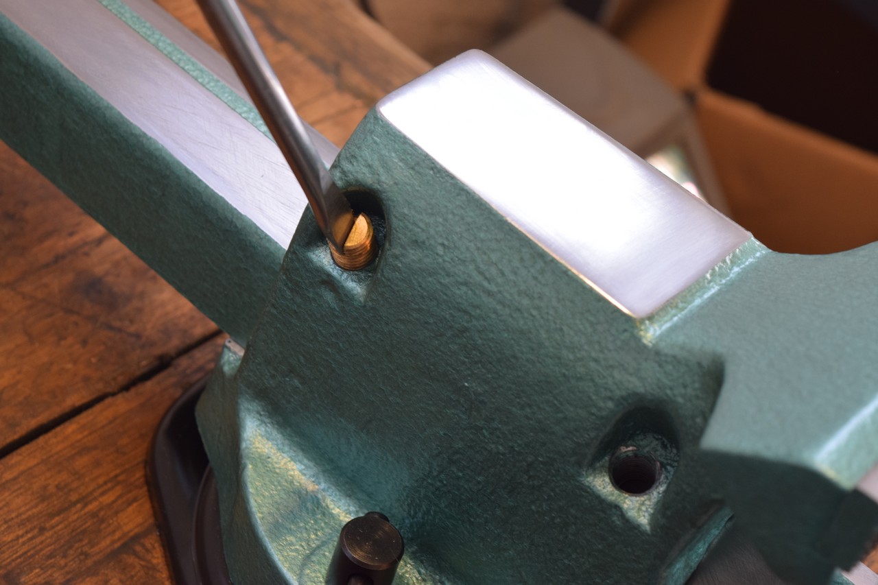 Les vis de réglages étant elles en laiton, elles ne sont pas grippées. Je les fais sortir par l’intérieur de l’étau à l’aide d’un simple tournevis.