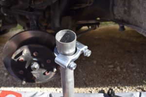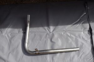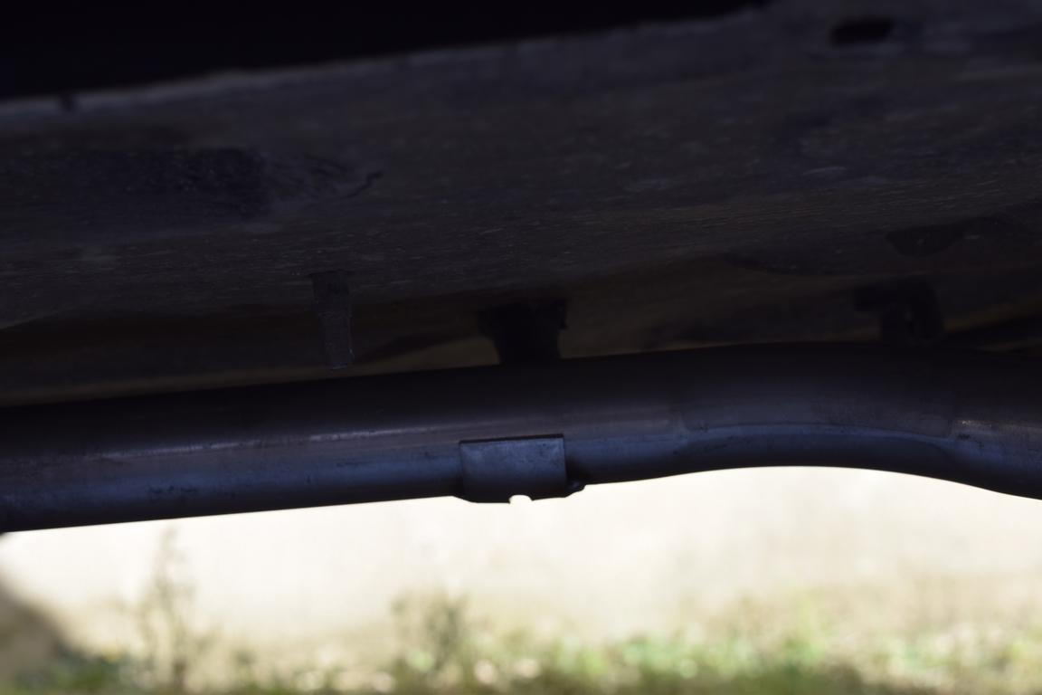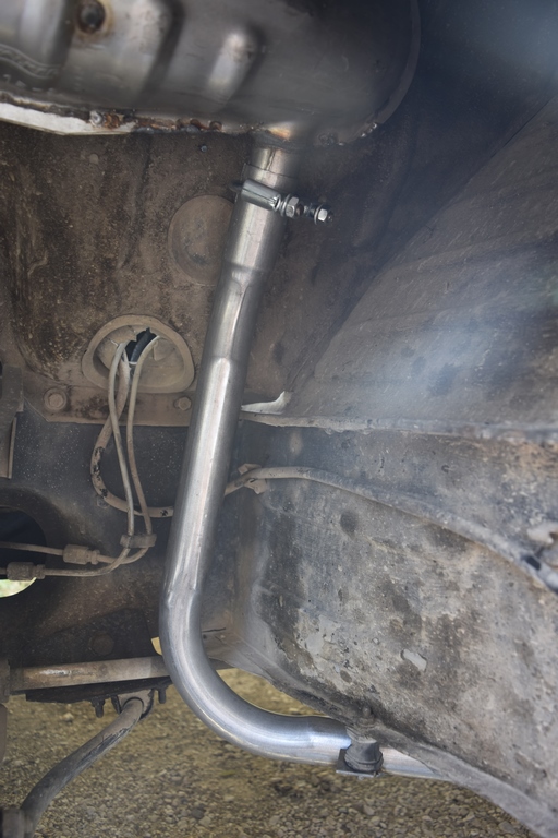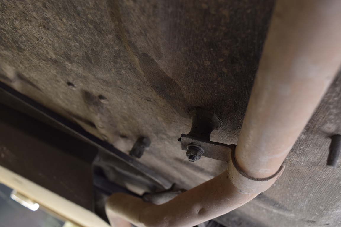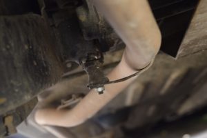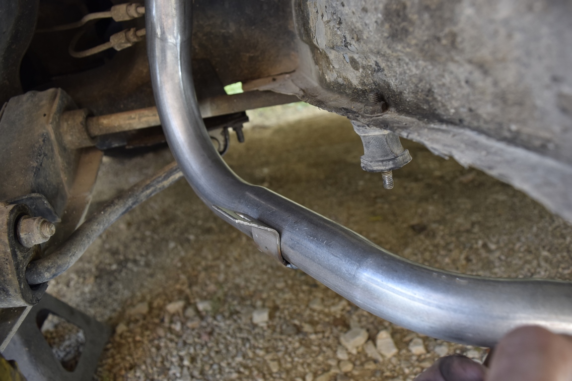 Le tube coudé vient s’insérer directement à la sortie du silencieux. Comme fait plus haut, on applique du mastic échappement et l’on serre le tout à l’aide d’un collier (diamètre 38). Il est conseillé également d’appliquer de la graisse au cuivre sur les filetages du collier. Ensuite, nous allons devoir fixer le tube au niveau du plancher à l’aide de la patte présente sur le tube et du silentbloc déjà existant. Attention, il faut bien souvent ajuster la patte de fixation (à l’étau ou à l’aide d’une pince multiprise) pour qu’elle soit parfaitement alignée au silentbloc.