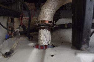 Si comme on l’a vu précédemment l’installation du silencieux dans l’aile a bien des avantages en ce qui nous concerne, il a néanmoins un défaut : sa proximité des aile et joue d’aile les fait beaucoup chauffer. Cela n’est pas un problème en soi, sauf lorsque l’on doit réaliser des opérations mécaniques dans le compartiment moteur, moteur chaud. Etant donné que cela nous arrive très souvent, on a décidé de remédier à cela, en installant un isolant thermique très haute température à proximité du silencieux.