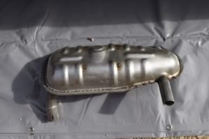 La ligne d’échappement neuve que nous allons monter sur notre 4L se compose de 3 parties : un silencieux que l’on va placer dans l’aile, un tube coudé reliant la sortie de silencieux jusqu’au dessous du plancher et le tube final qui fera la sortie d’échappement sur le côté. Voici les références des pièces que nous avons utilisé :